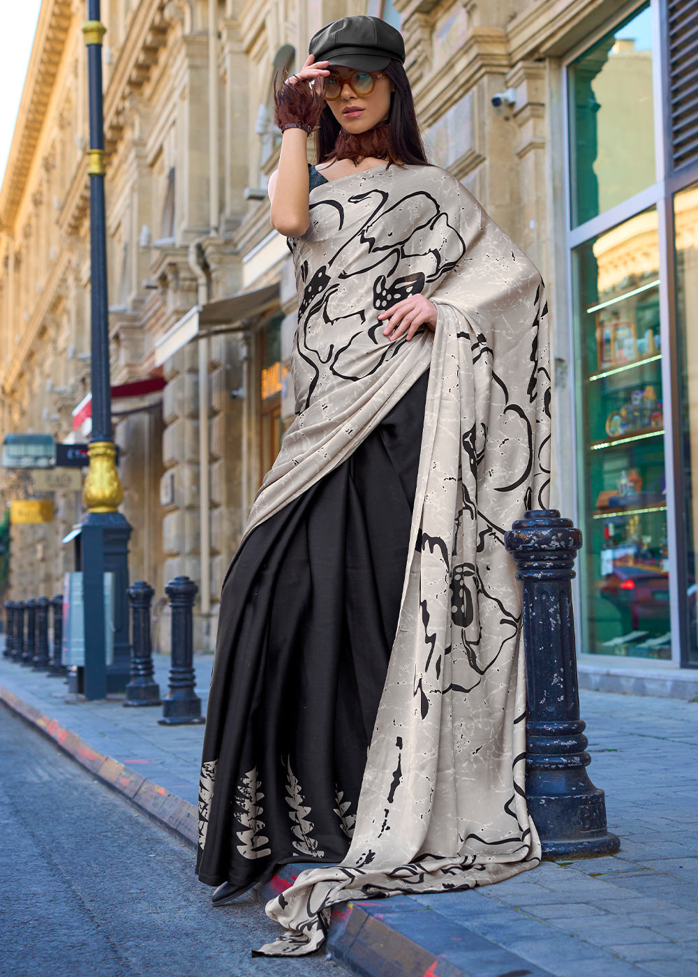 Abalone Grey & Black Contemporary Printed Satin Crepe Saree : Top Pick