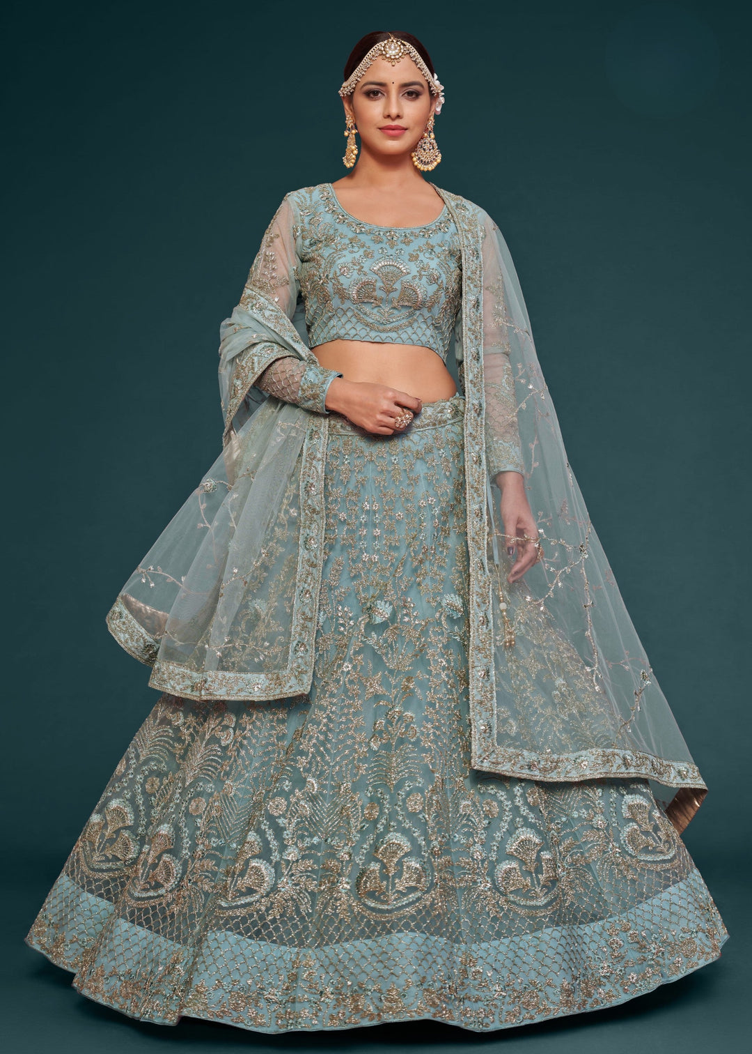Aqua Blue Soft Net Lehenga with Thread, Zari, Badla and Glitter Dori Embroidery Work