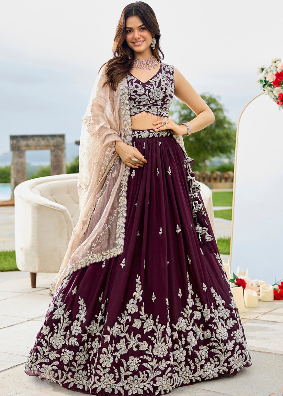 Wine Satin Silk Lehenga Choli