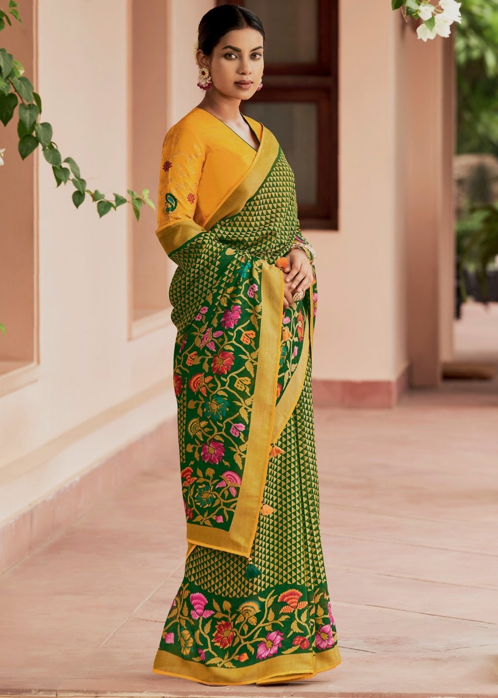 Yellow & Green Soft Silk Saree with Embroidered Blouse
