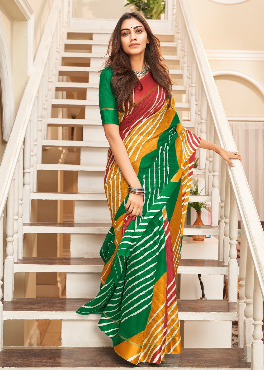 Yellow & Green Leheriya Printed Cotton Saree : Top Pick