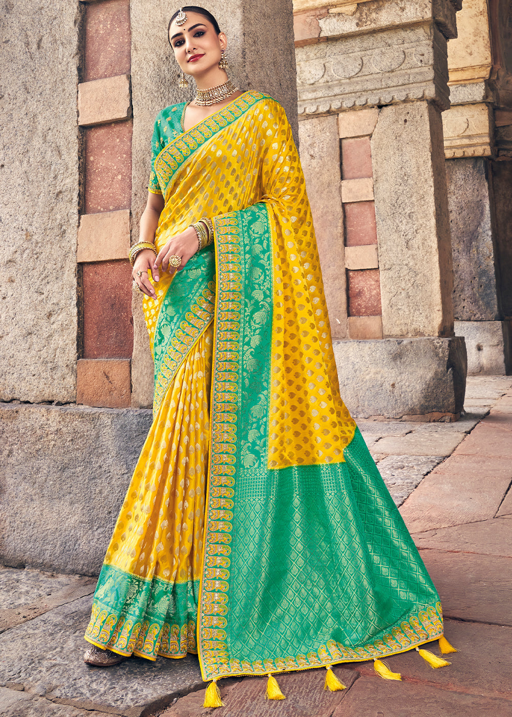 Yellow and Green Half N Half Silk Saree with Embroidered work : Top Pick