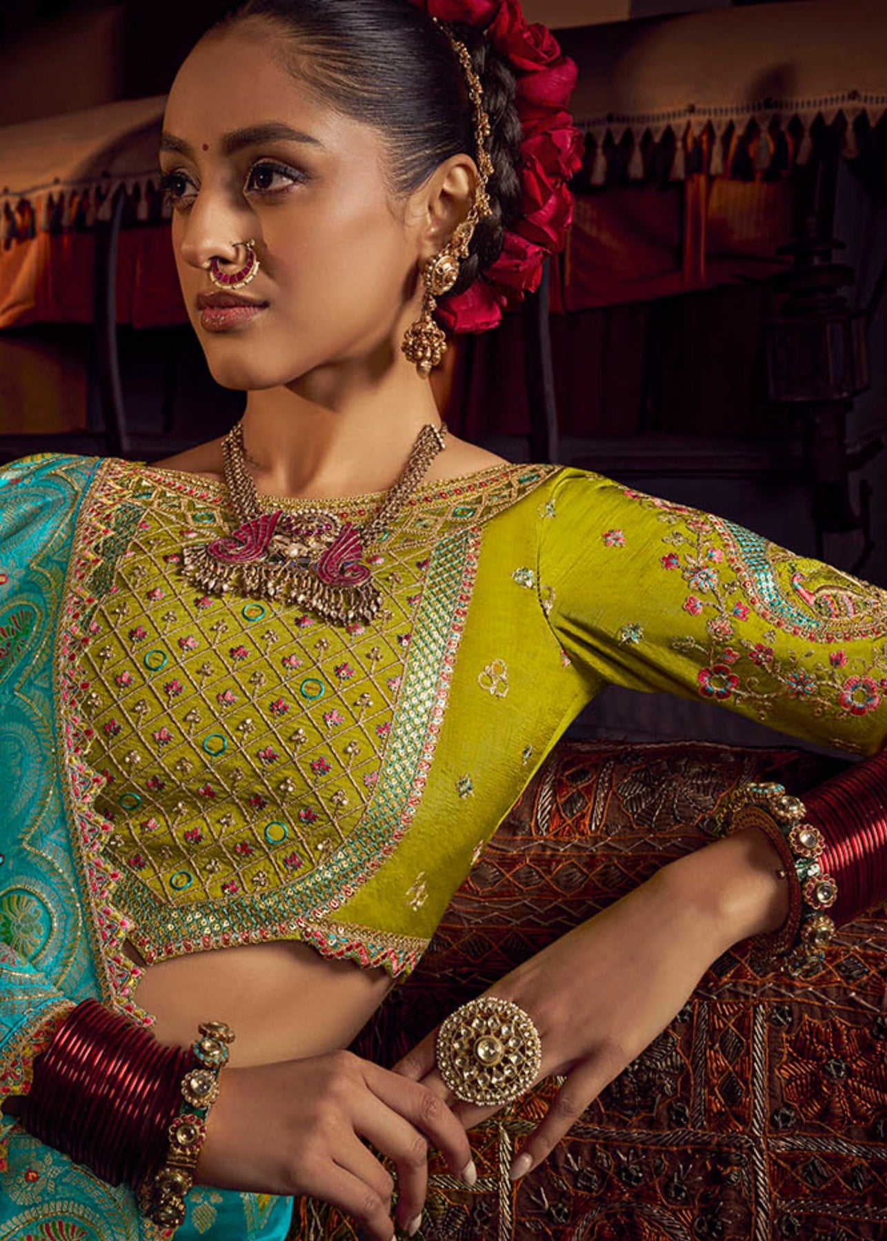 This cyan blue pure viscose dola silk saree features intricate handwork on the blouse and pallu, adding a touch of elegance to your ensemble. The rich fabric drapes gracefully, offering both comfort and style. Perfect for weddings and festive occasions, this saree combines traditional craftsmanship with contemporary design. Enhance your ethnic wardrobe with this exquisite piece that embodies timeless beauty.