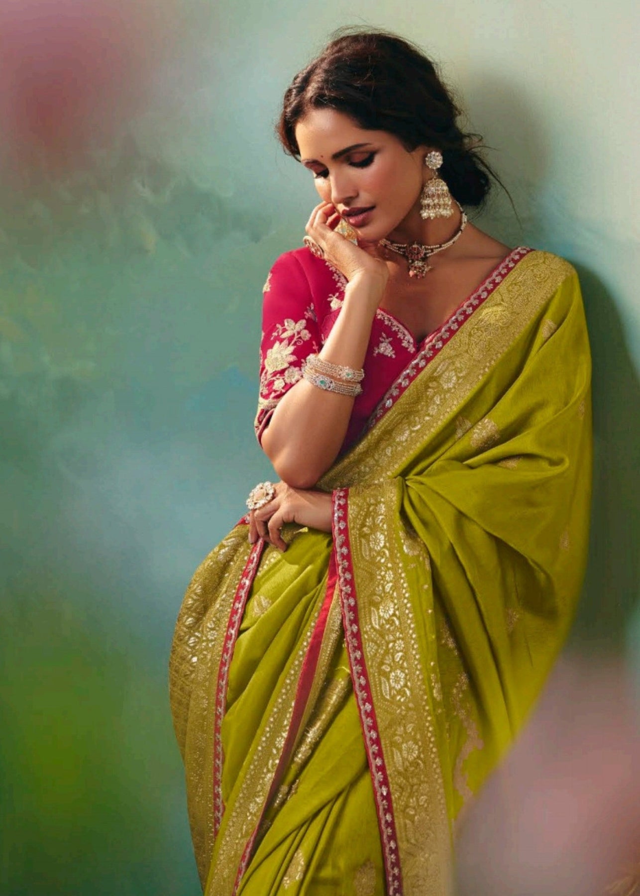 Step into timeless elegance with this olive green pure viscose dola silk saree, an exquisite blend of sophistication and traditional artistry. Crafted from premium viscose dola silk, this drape flows gracefully with a gentle sheen that mirrors pure silk while remaining lightweight and breathable — perfect for all-day wear.