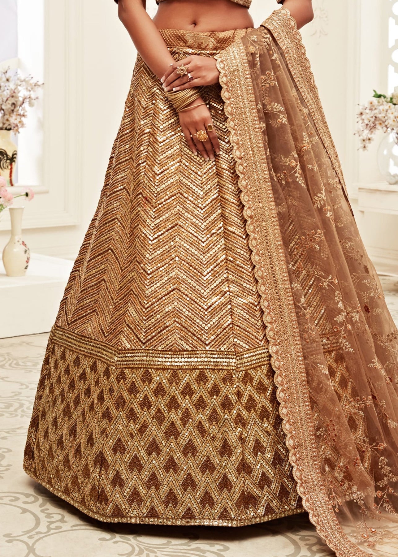 Brown Slub Silk Lehenga With Thread, Zari, Dori and Sequins Embroidery Work