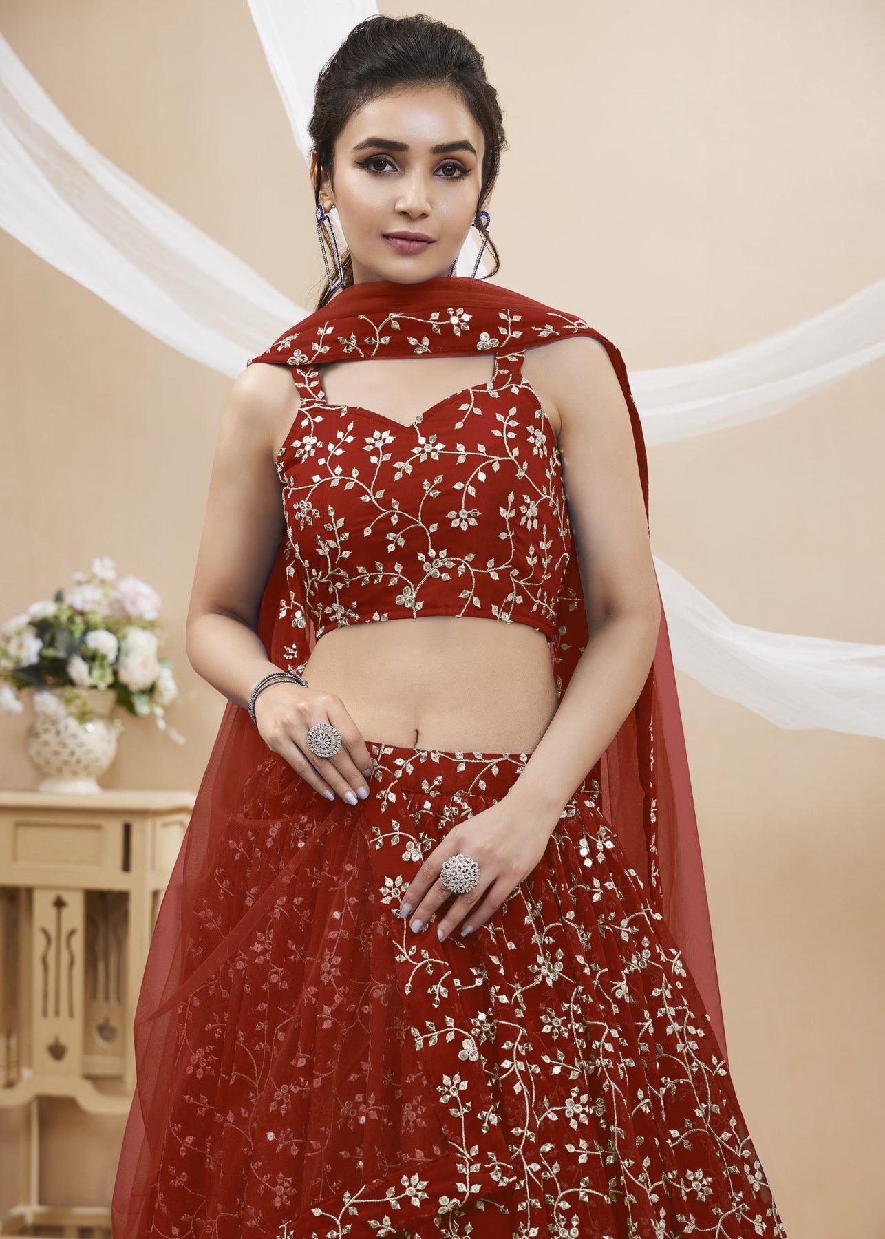 This Maroon Red Georgette Lehenga Choli features exquisite sequins and zari embroidery that enhances its rich, traditional look. Perfect for festive occasions, it combines luxury and elegance with a flattering fit. The lehenga’s flowing design and intricate detailing make it a timeless piece for any celebration. Ideal for weddings or special events, this lehenga choli ensures you'll stand out with grace and style.