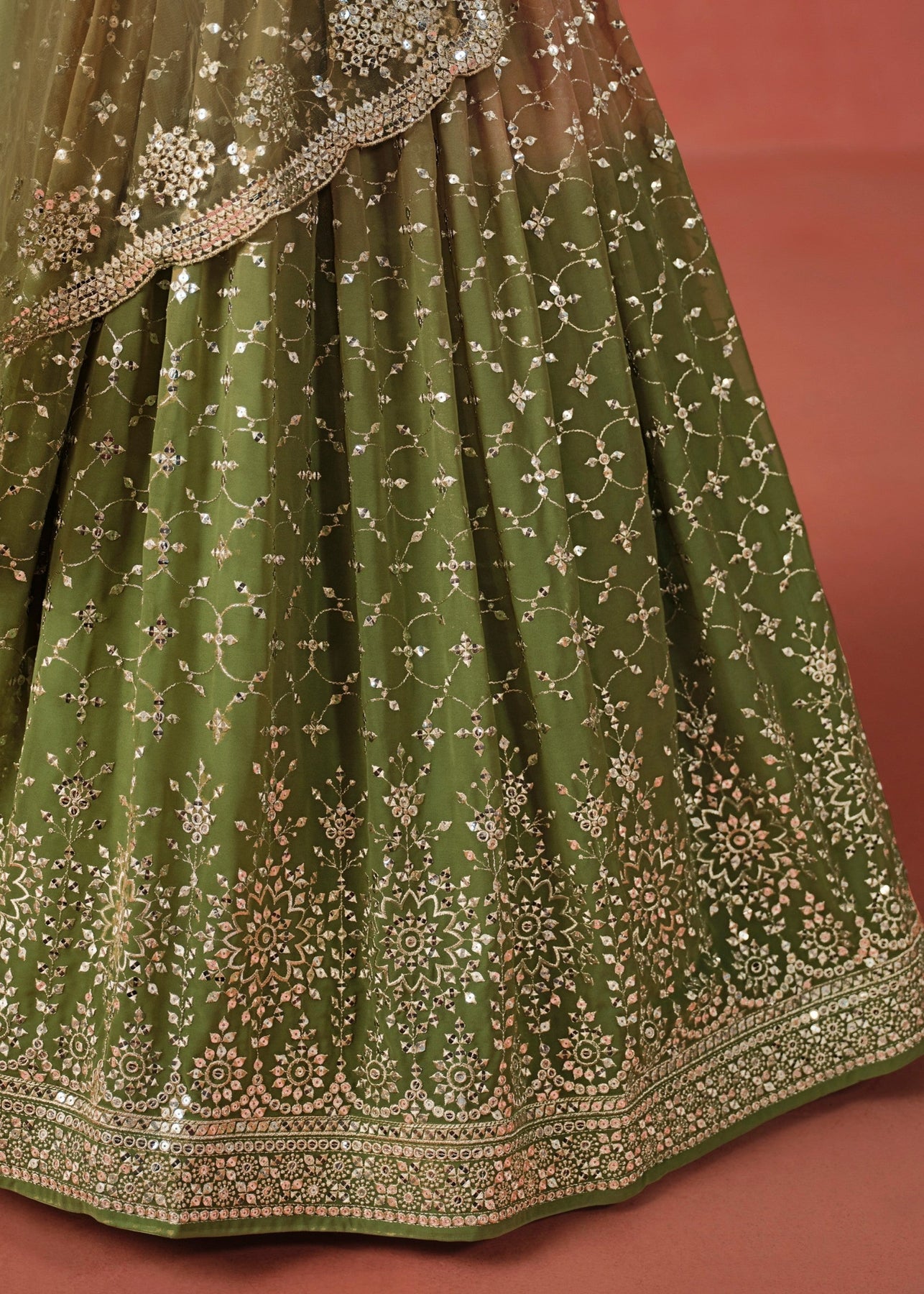 This Mehndi Sequins Zari Embroidered Work Georgette Lehenga is a gorgeous Indian ethnic ensemble in a rich mehendi (olive‑green) hue, crafted from blended georgette fabric. It features delicate yet vibrant accents of sequins and zari embroidery, perfect for weddings, festive celebrations, or special events.