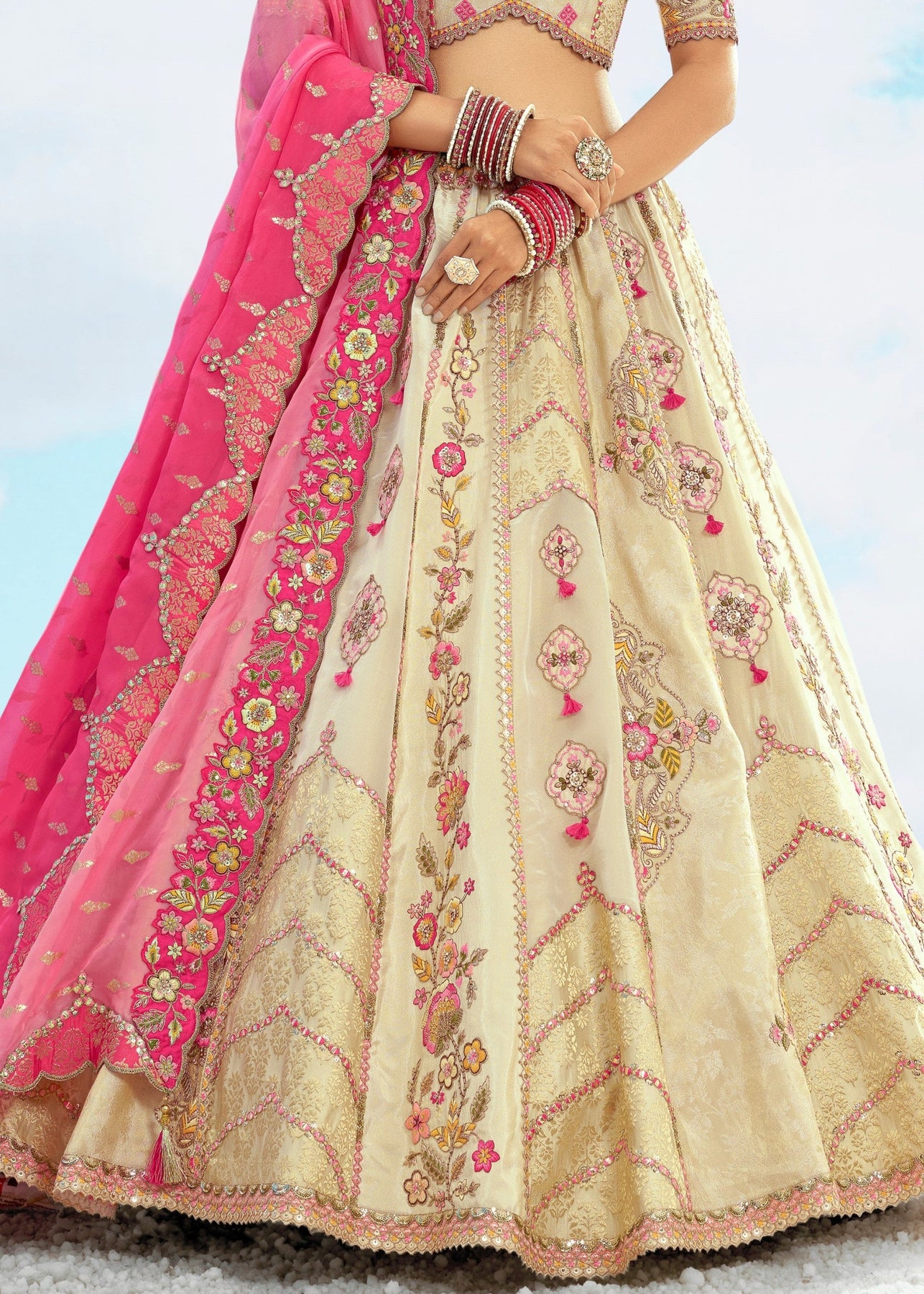 The Off-White and Magenta Lehenga with Cut Work Border is a stunning ensemble that beautifully marries traditional craftsmanship with contemporary design. Crafted for festive occasions and special events, this lehenga set is designed to make a lasting impression.