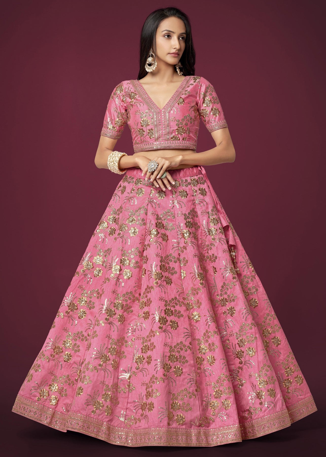 Pink Slub Silk Lehenga with Zari Sequins and Dori Embroidery Work
