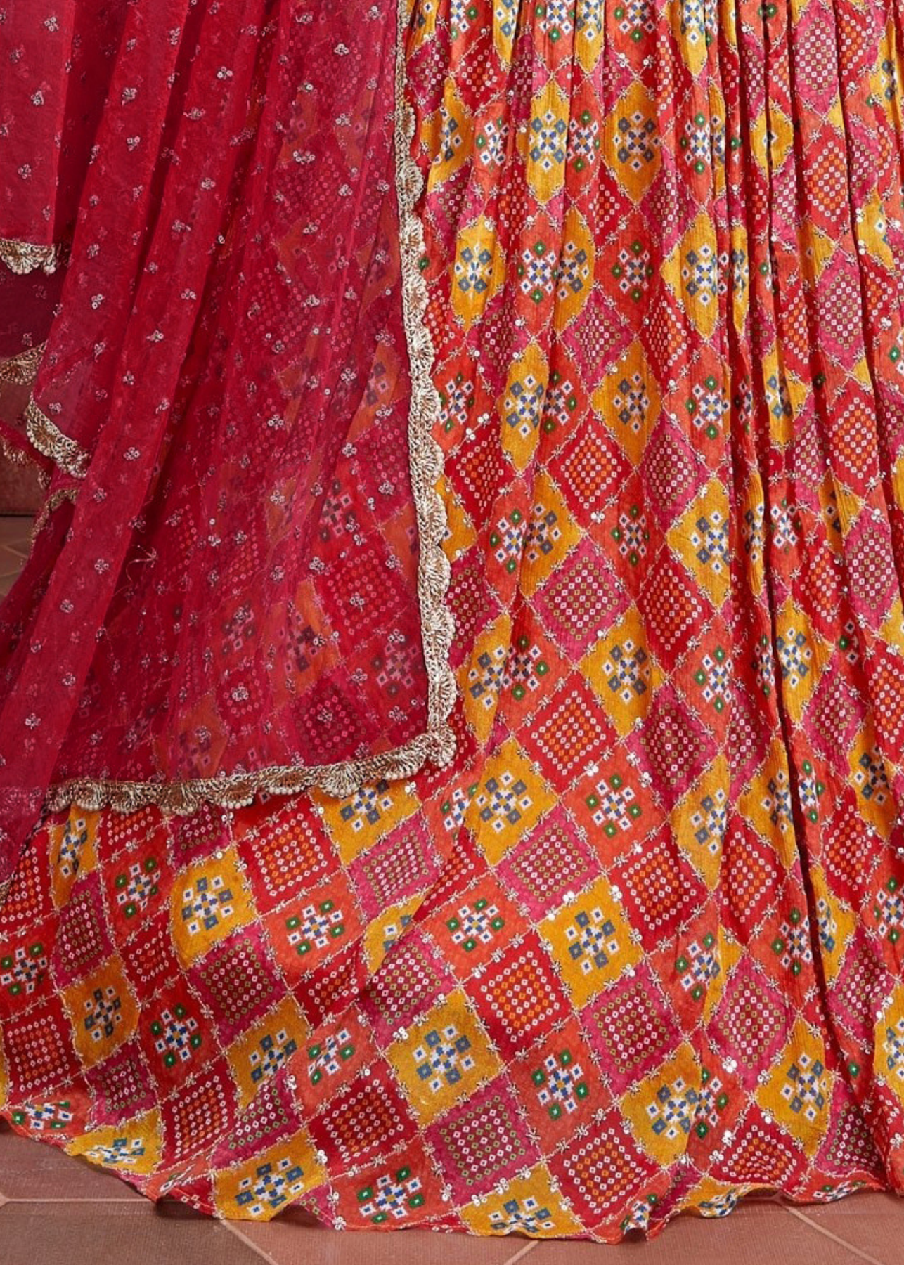 A priceless piece, reloading attitude, and oozing out a pinch of swag to the wearer! This Red & Orange Bandhani Printed Chinon Silk Lehenga Choli is perfect for your next family function or a casual occasion. The delicate Embroidery & Mirror work showcases an effortless unforgettable affair and elevates its appeal. Pair it with heels and rock the show.