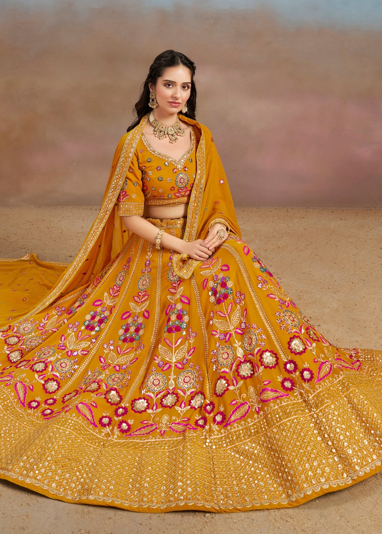Drape yourself in sunshine with this vibrant yellow lehenga set, designed to make you radiate joy, elegance, and timeless charm. Crafted in luxurious georgette and adorned with intricate embroidery work, this ensemble celebrates Indian craftsmanship in every stitch.