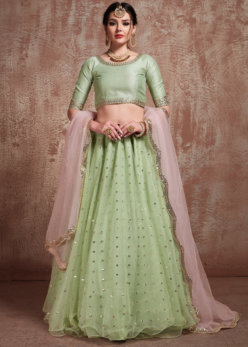 Pista Green & Pink Designer Soft Net Lehenga Choli with Sequins, Thread & Zari work : Top Pick