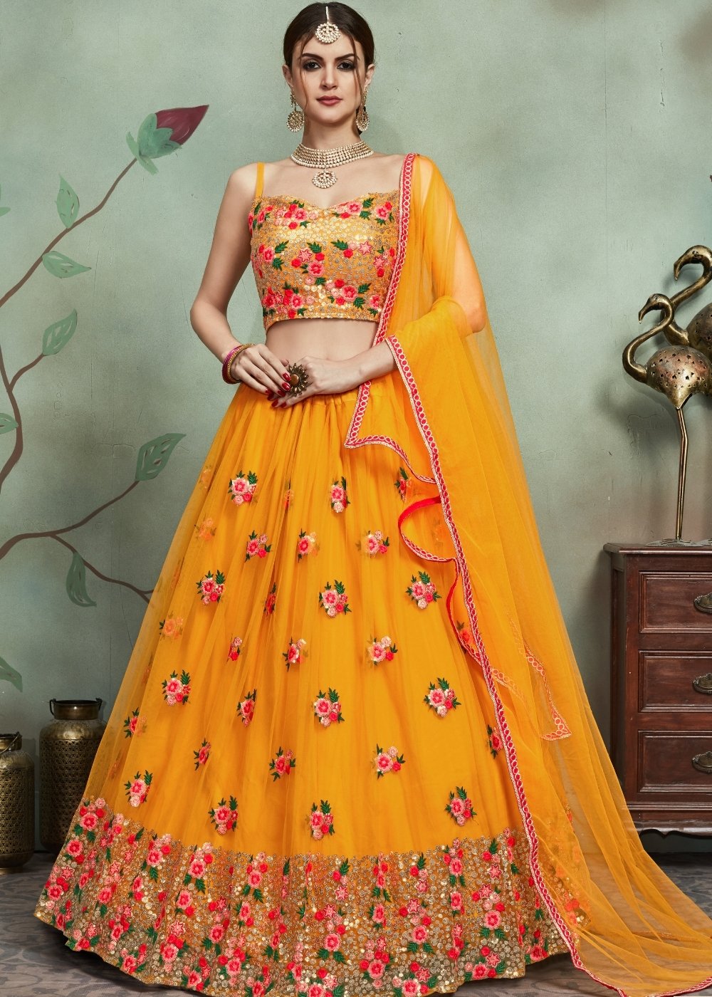 Gold Yellow Designer Soft Net Lehenga Choli with Sequins & Thread work