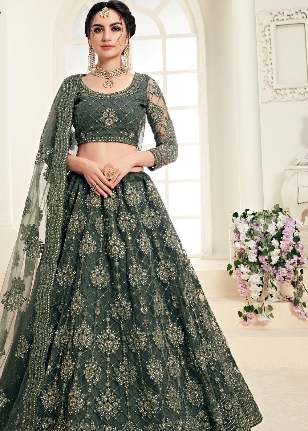 Mehendi Green Soft Net Lehenga Choli with Cording Embroidery & Stonework
