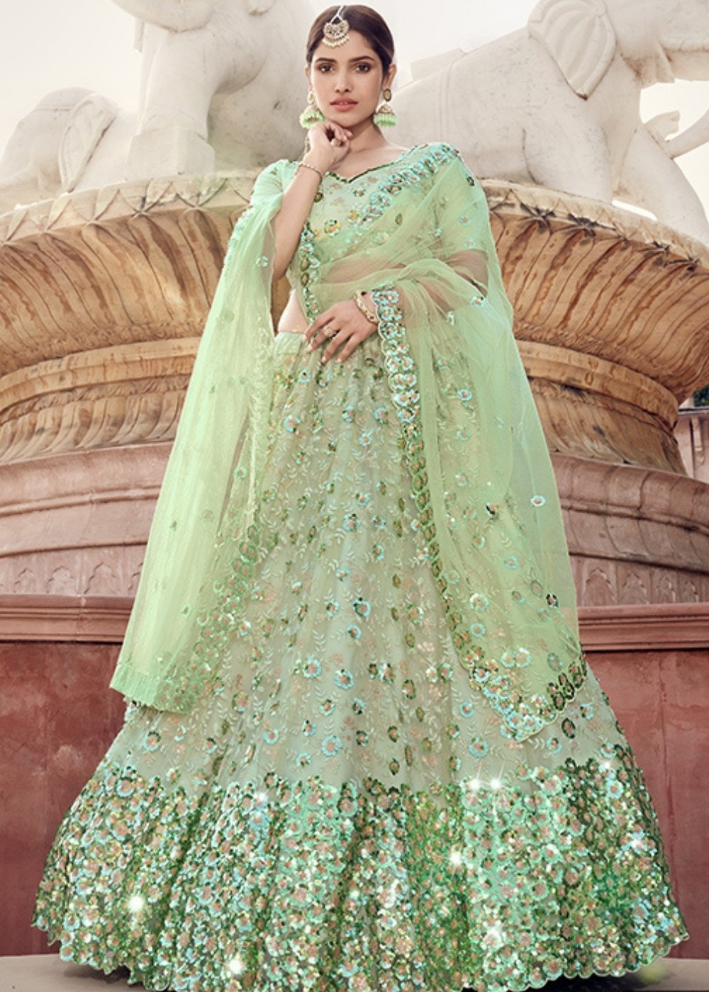 Mint Green Designer Soft Net Lehenga Choli with Sequins & Thread work