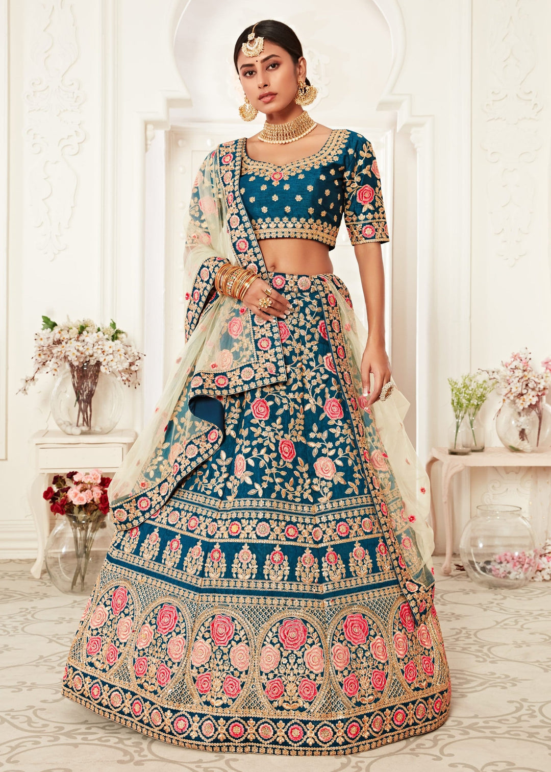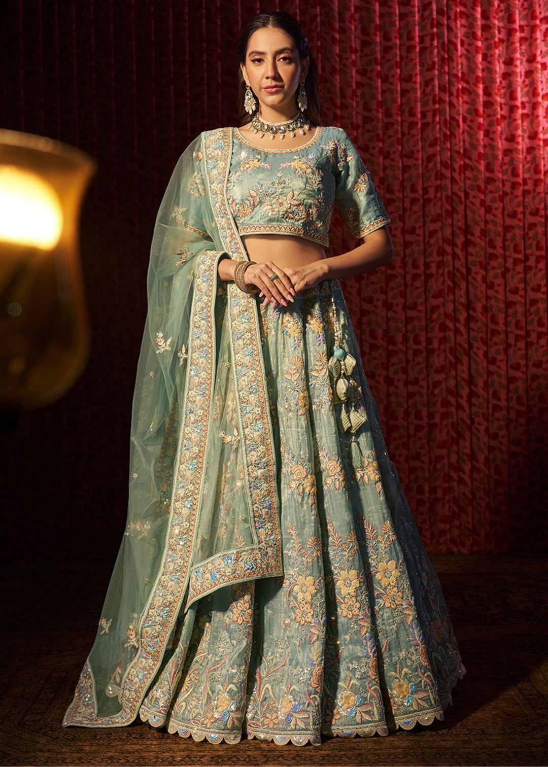 Ocean Aqua Soft Net Lehenga with Thread, Zari, Badla and Glitter Dori Embroidery Work
