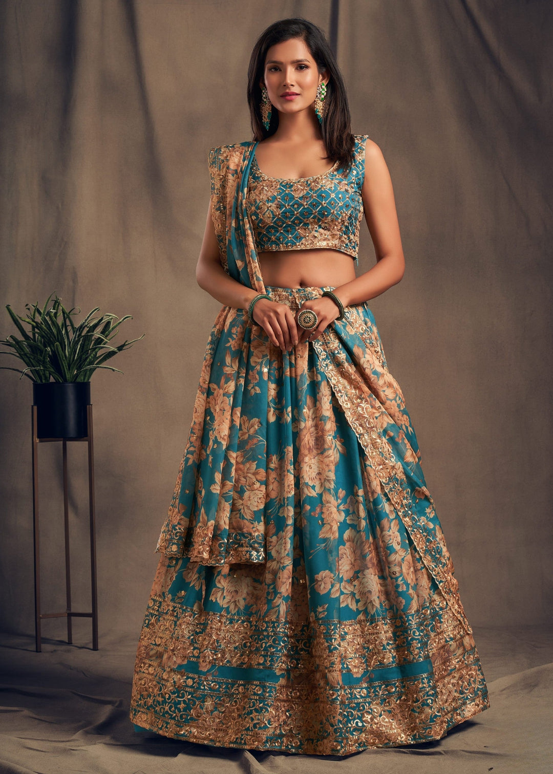 Teal Blue Organza Lehenga Sequins Zari Embroidery Work
