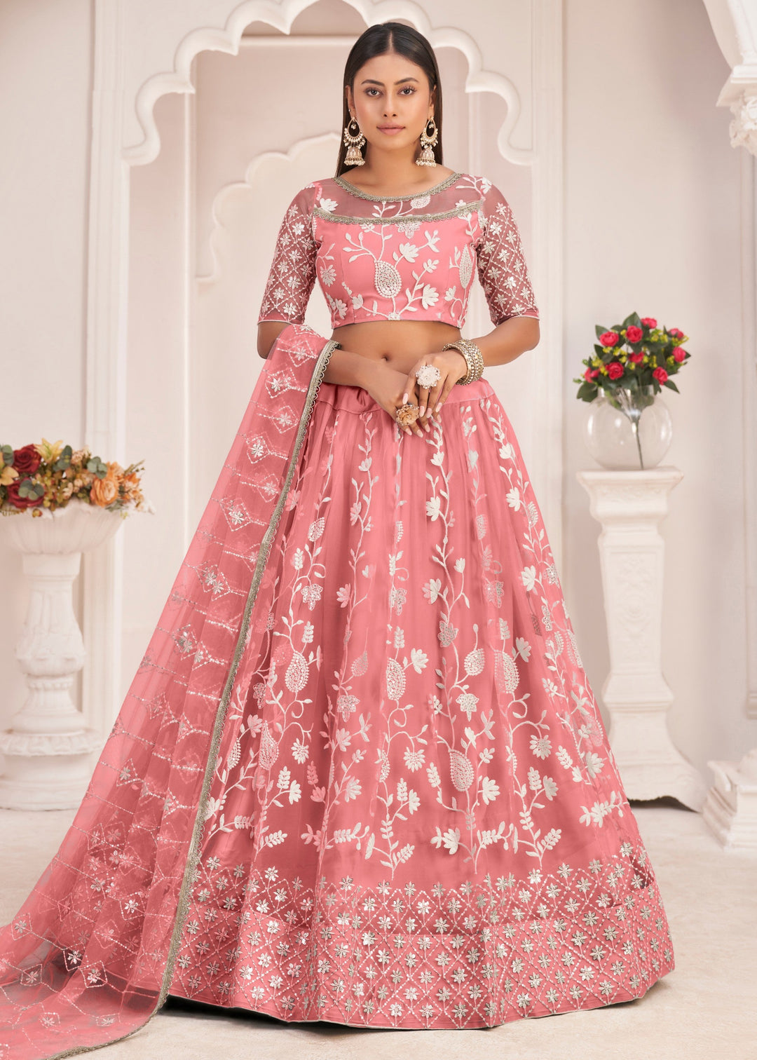 Salmon Pink Designer Soft Net Lehenga With Cotton Thread And Sequins Embroidery Work