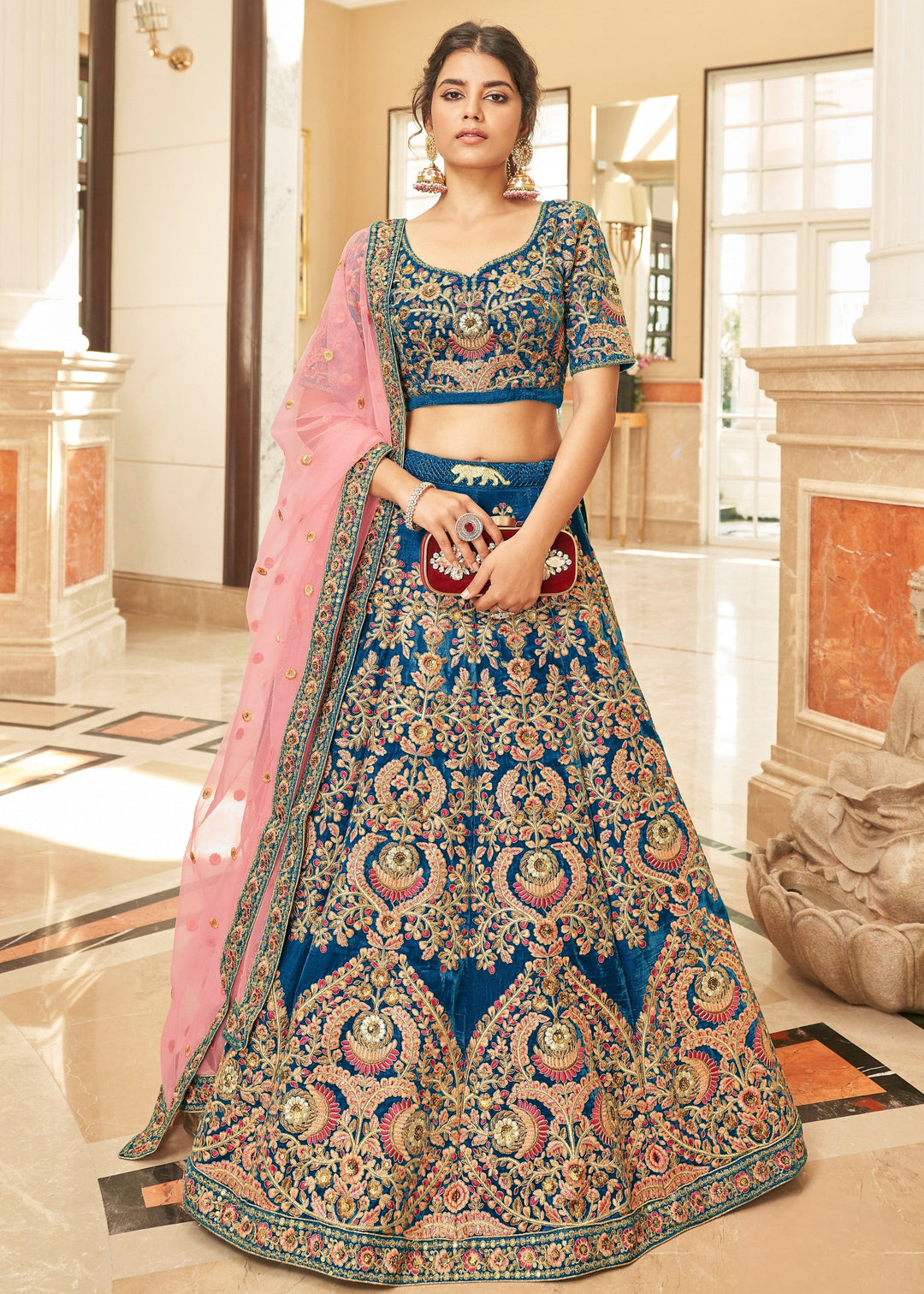 Cerulean Blue Velvet Lehenga Choli With Thread & Zari Embroidery Work