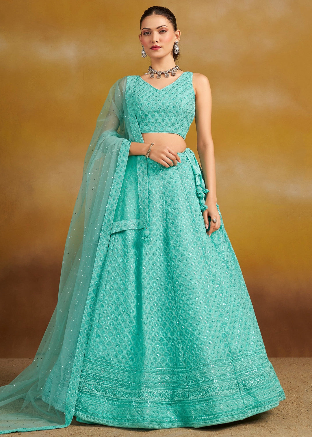 Mehndi Sequins Zari Embroidered Work Georgette Lehenga