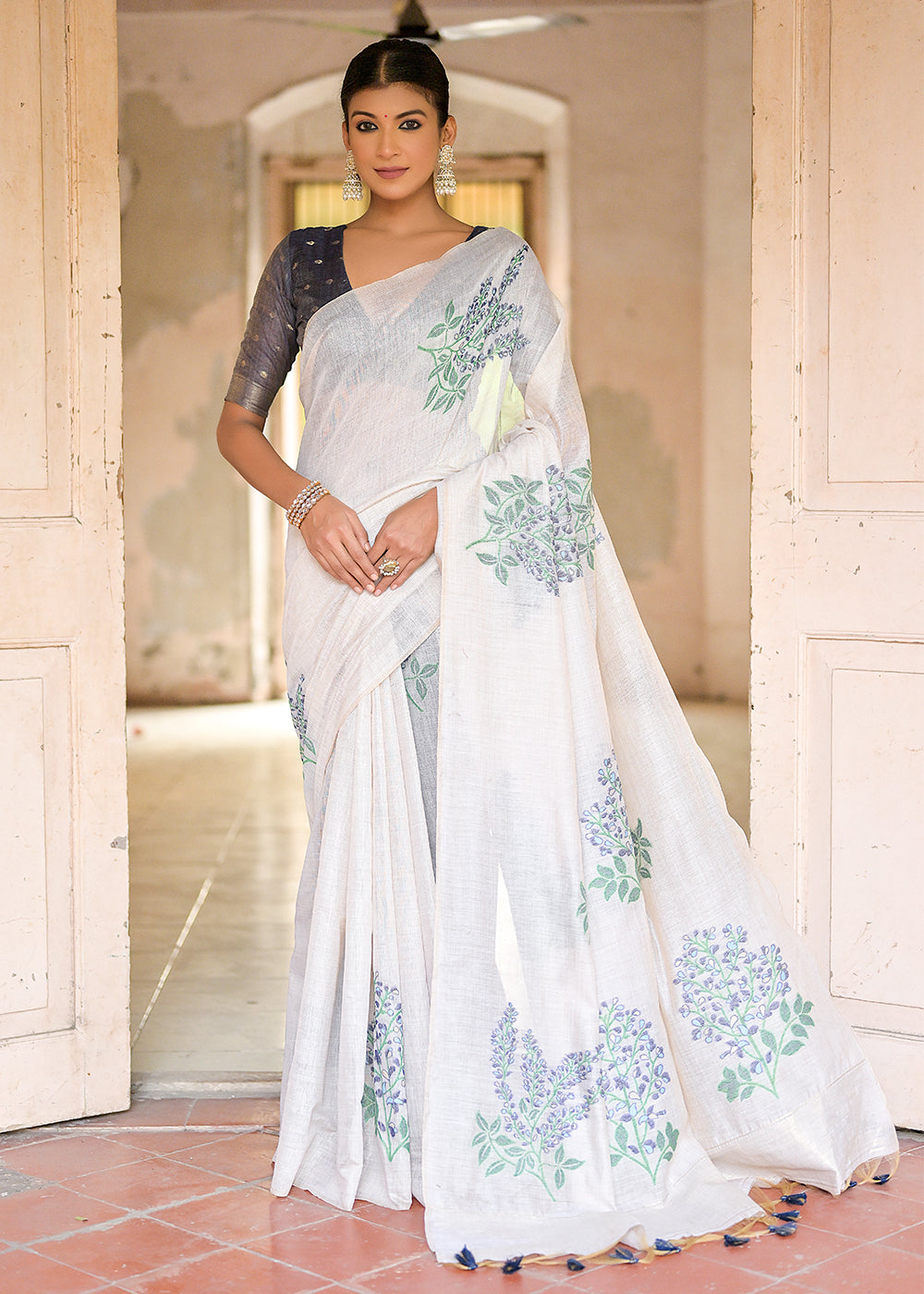 Cream White Floral Printed Soft Tussar Silk Saree : Top Pick