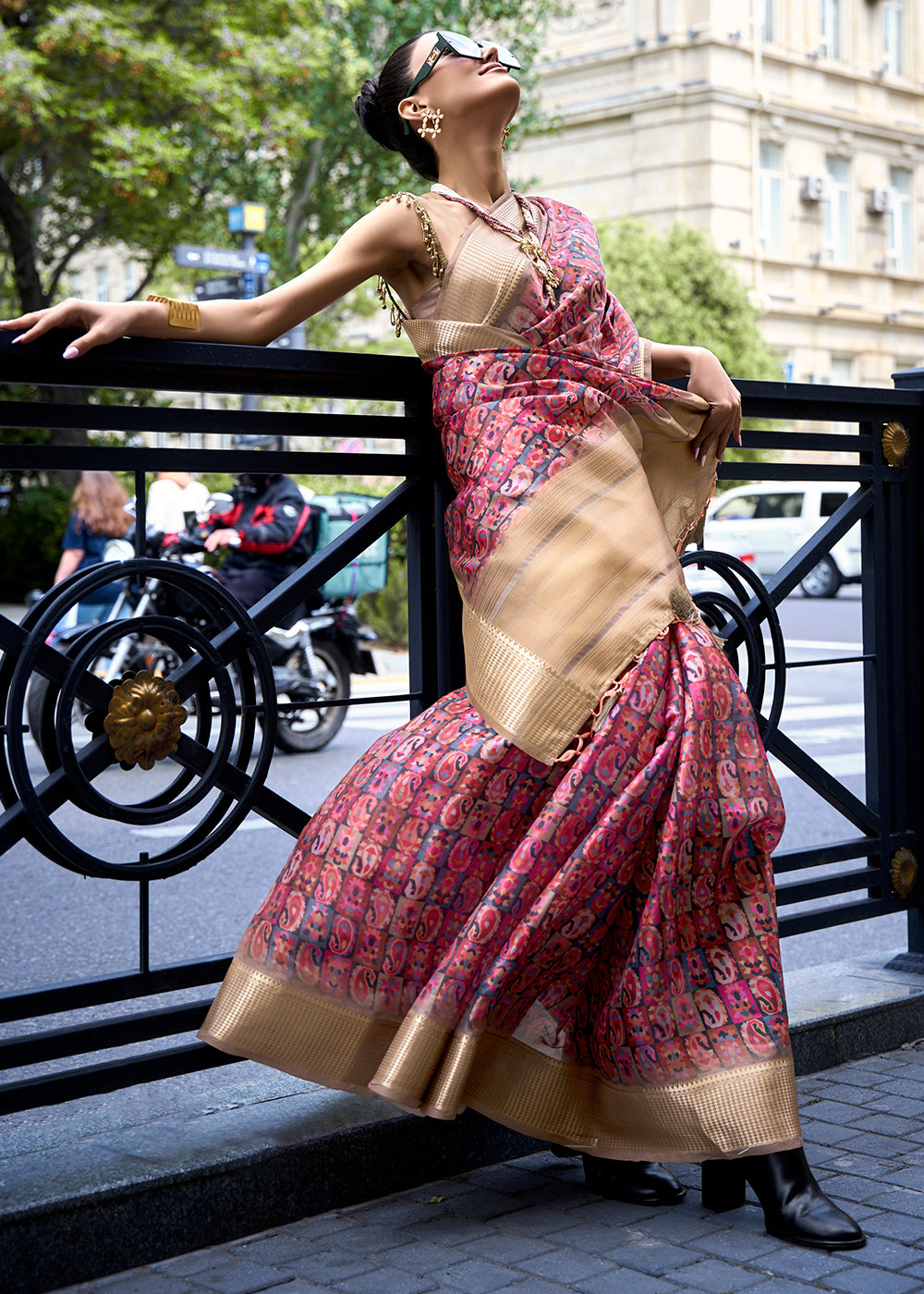 Here comes a mesmerizing ethnic ensemble that embodies grace and sophistication. This Cerise Pink Floral Printed Satin Organza Saree is a rejuvenating choice for casual occasions. Satin fabric provides it a smooth touch and Organza makes it a lightweight pick. Pair this saree with matching earrings and shine like a diva.