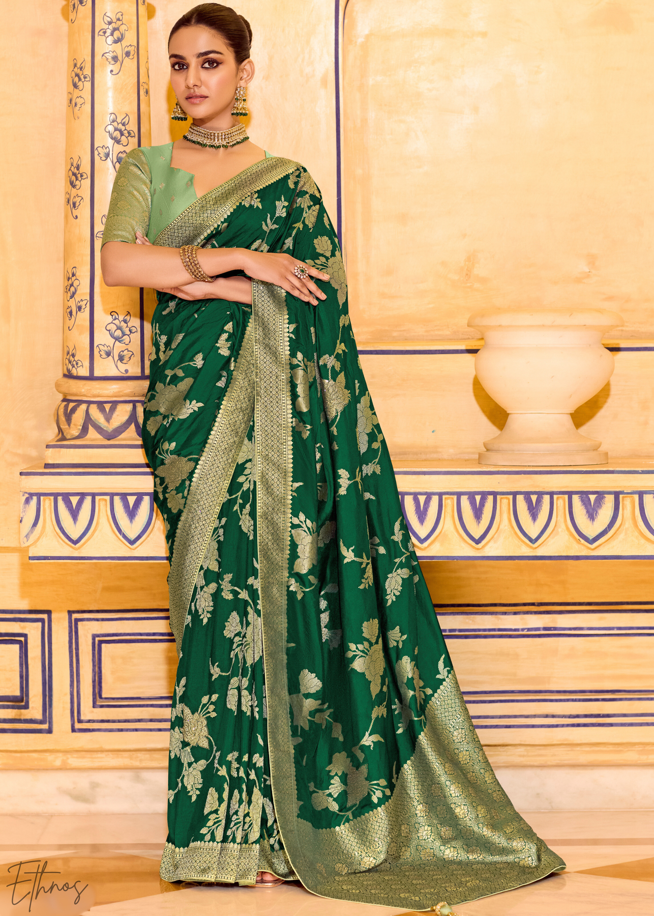 Adorn yourself in a regal blend of artistry and tradition with this stunning emerald green crepe silk saree. Featuring rich zari work and intricate motifs throughout the body and border, this saree radiates elegance and sophistication. The premium, soft fabric ensures both a lightweight feel and a beautiful, flowing drape, perfect for any grand festivity.