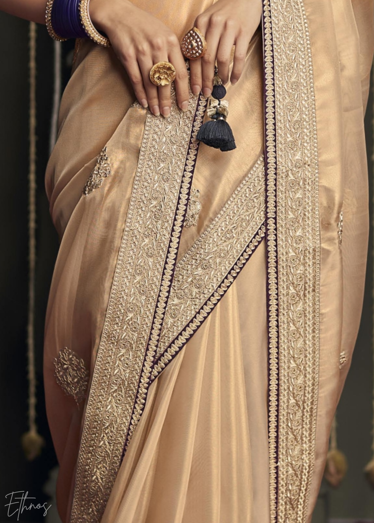 Drape yourself in pure sophistication with this stunning peach organza silk saree that's basically a wearable work of art. Adorned with intricate zari and thread embroidery that catches the light beautifully, it's your go-to for weddings, festivals, and those moments when you want to turn heads. Crafted for those who appreciate the finer things—superior quality, timeless elegance.