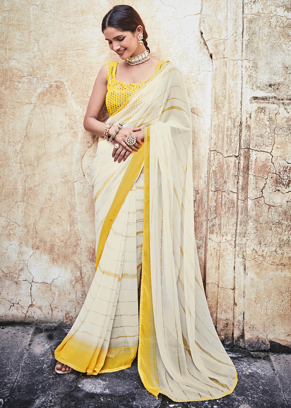 Loose yourself in the appeal of this serene Pearl White Printed Georgette Saree and be a trendsetter. A sober delicacy to adorn and flaunt, this comes graciously beautified with a radiant yellow border and exquisite Gota & Thread work that makes it look exotic. Go for this luscious piece to add a lovely vibe to your persona.