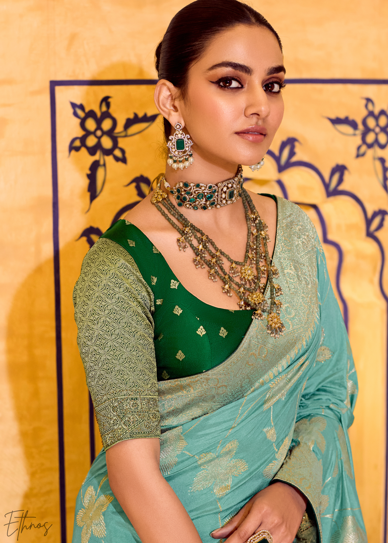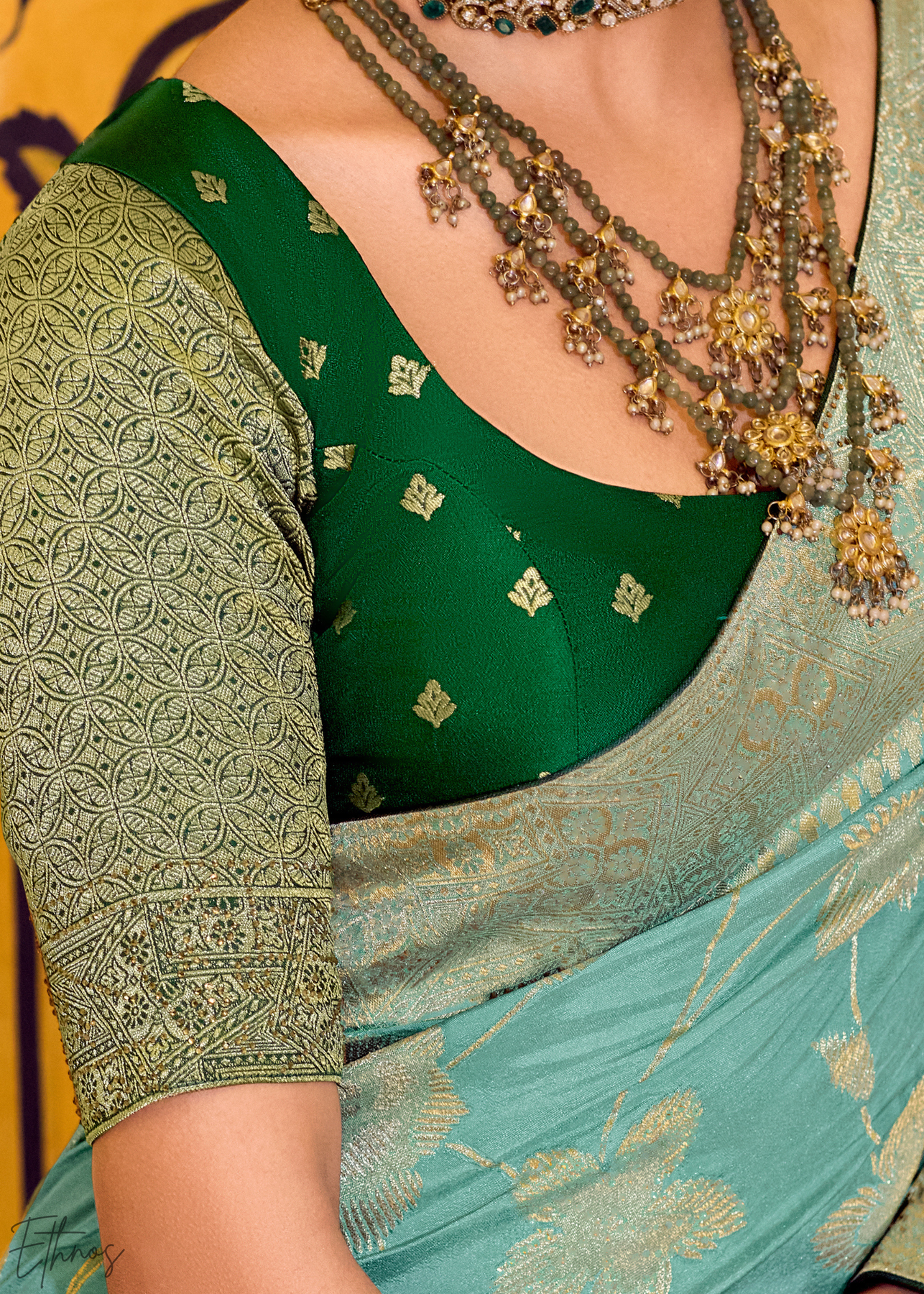 Blouse Fabric: Premium crepe silk with zari weaving.