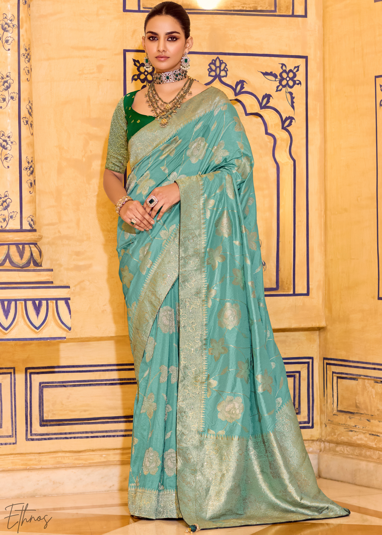 Elevate your festive look with this outstanding teal green crepe silk saree, featuring rich zari work and a captivating sheen. The soft, luxurious fabric drapes gracefully and offers exceptional comfort for all-day wear. Paired with a complementary dark green blouse, this is an elegant addition to any wardrobe, perfect for special occasions.