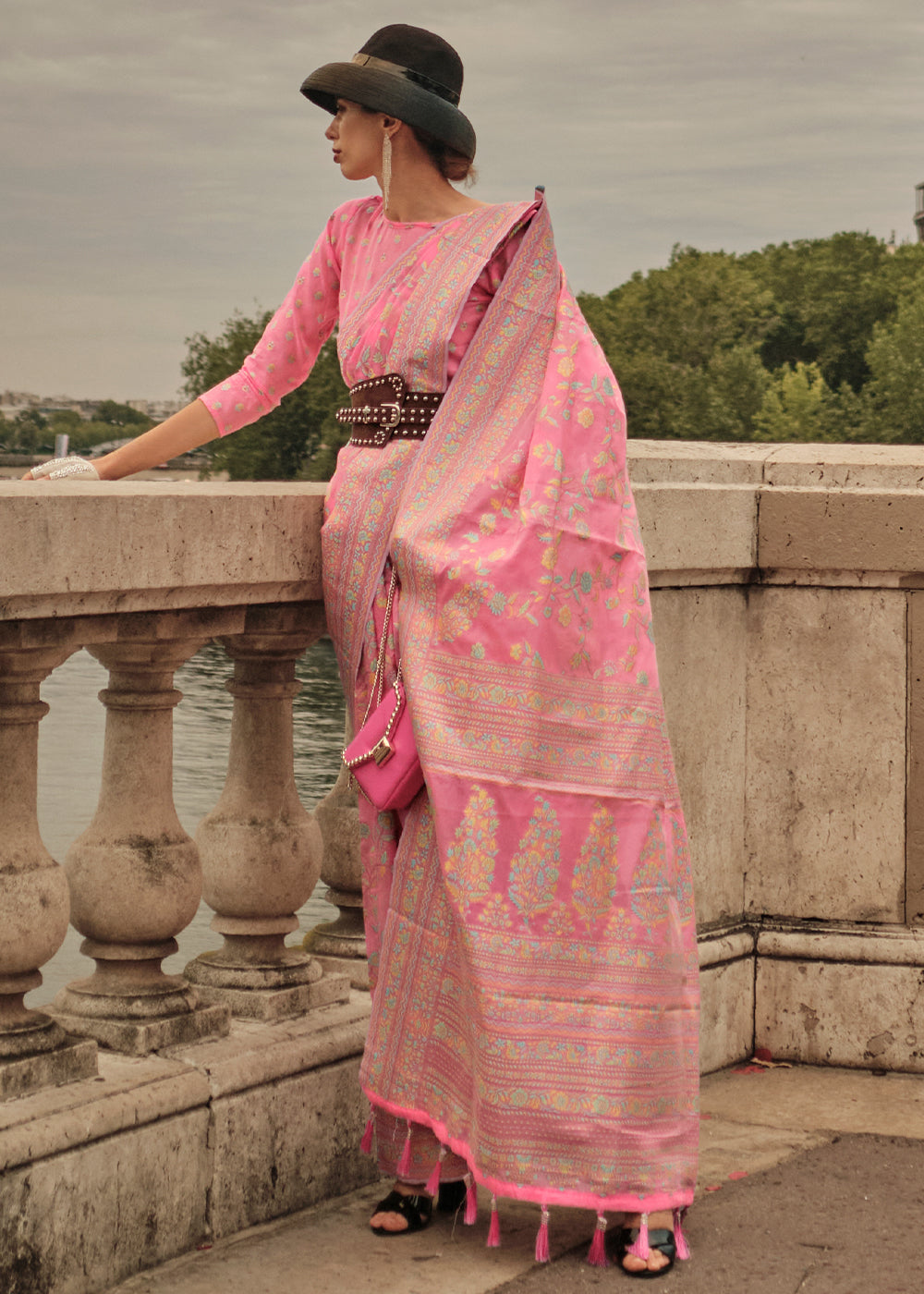 Watermelon Pink Woven Kashmiri Organza Silk Saree, a stunning piece that merges heritage craftsmanship with contemporary charm. The exquisite woven Kashmiri patterns reflect the artistry of traditional weaving techniques. This saree is ideal for the modern woman who seeks to balance elegance with effortless style.The lightweight organza silk ensures a graceful drape, giving you a flattering silhouette that’s perfect for weddings, festive occasions, or formal events. The intricate detailing adds a regal touch, making this saree a showstopper. Pair it with a fitted blouse and minimalistic jewelry for a refined look.
