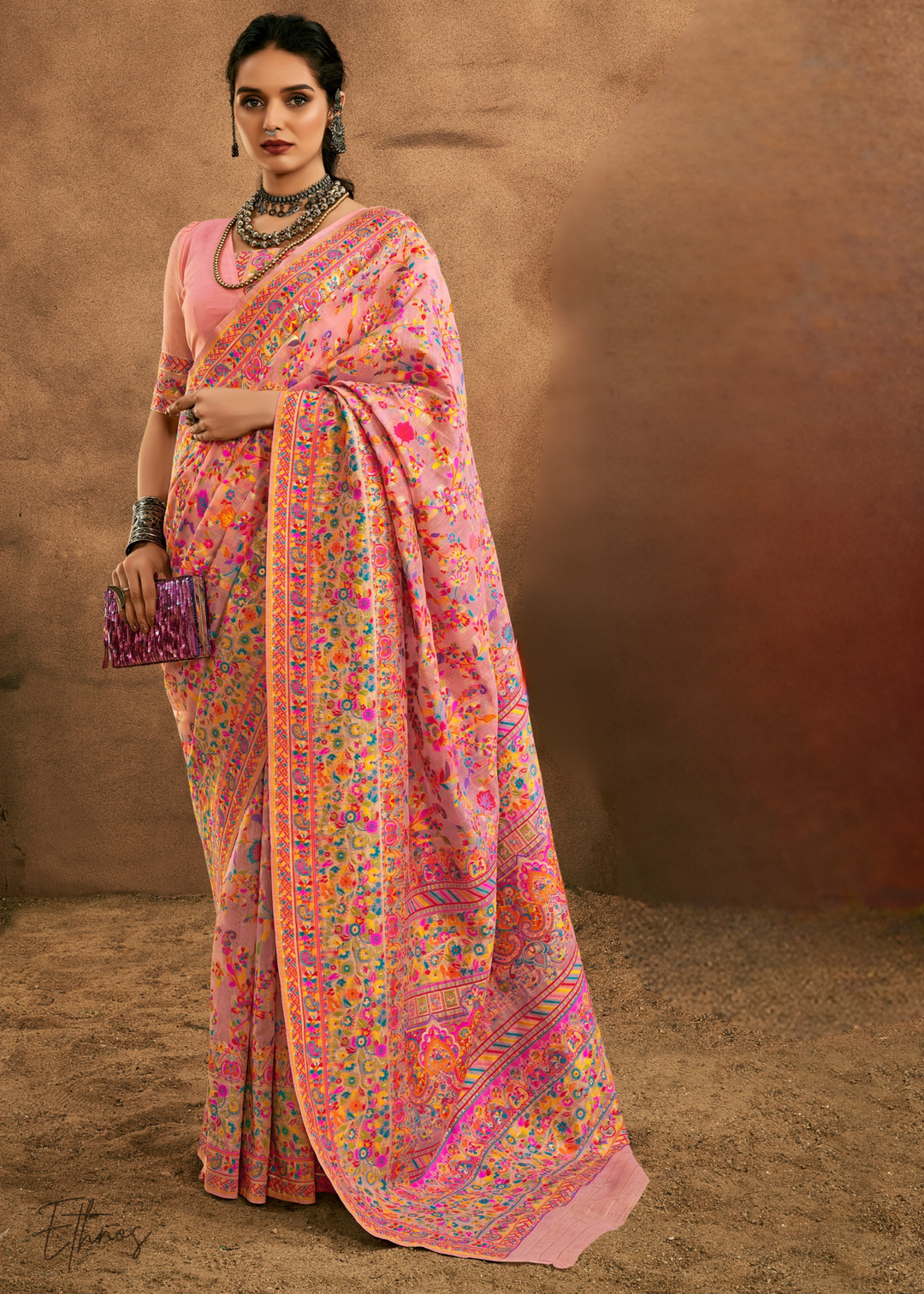 Soft Blush Pink with Multicolour Kashmiri Floral Weaving Saree