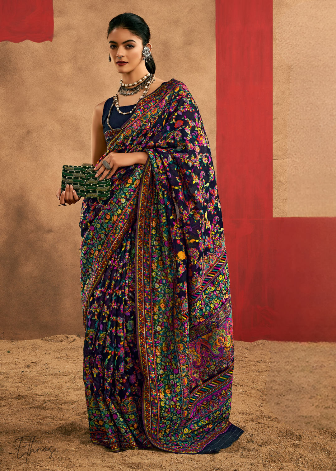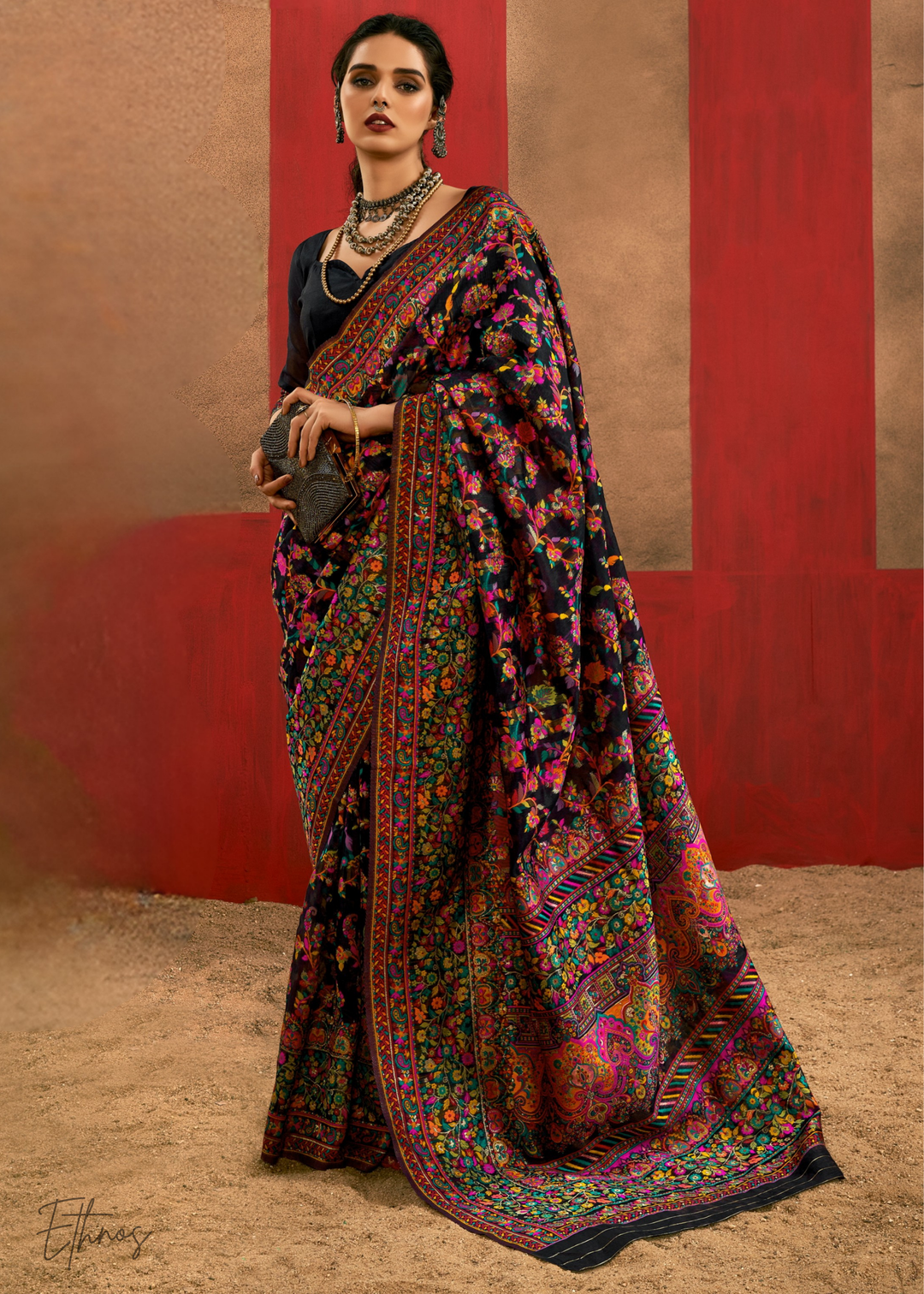 Noir Black with Multicolour Kashmiri Floral Weave Saree