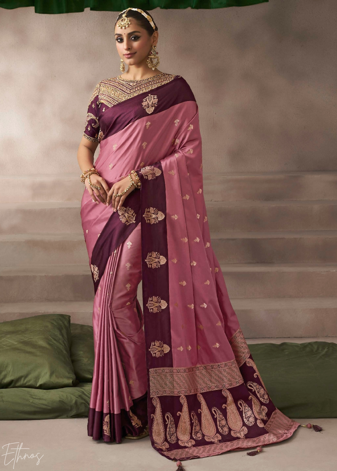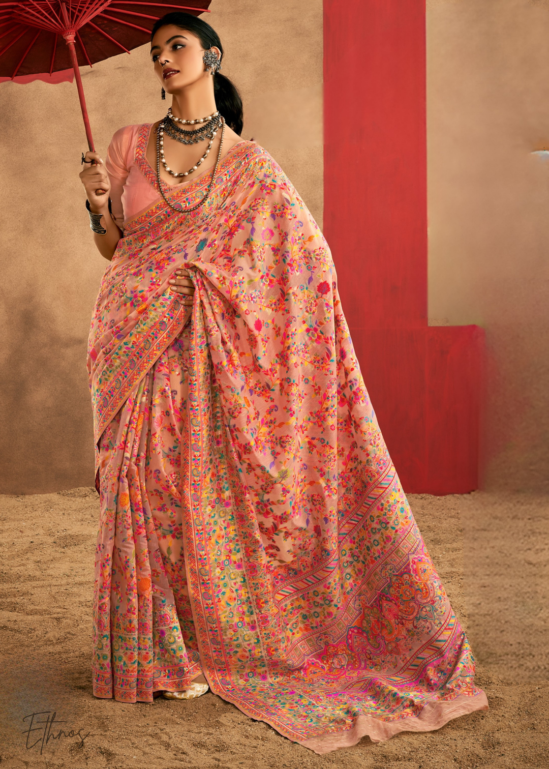 Blush Peach with Multicolour Kashmiri Floral Weave Saree
