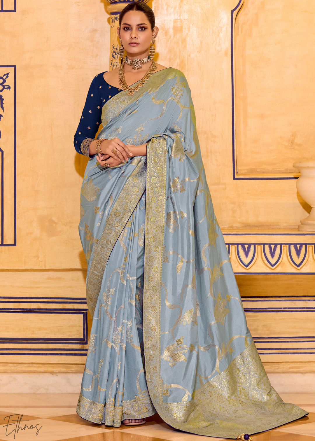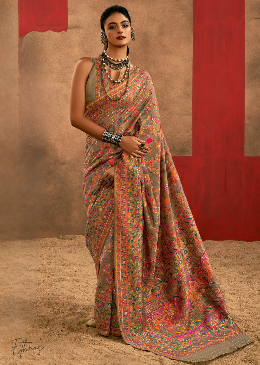 Olive-Taupe with Multicolour Kashmiri Floral Weaving Saree