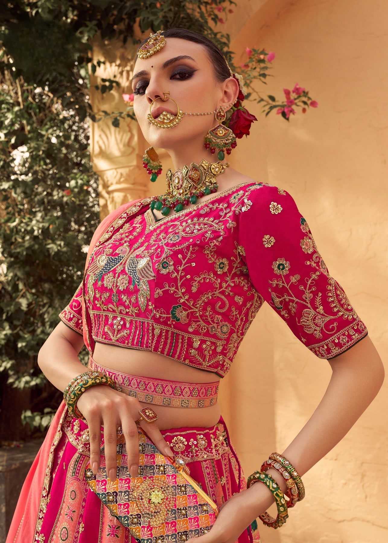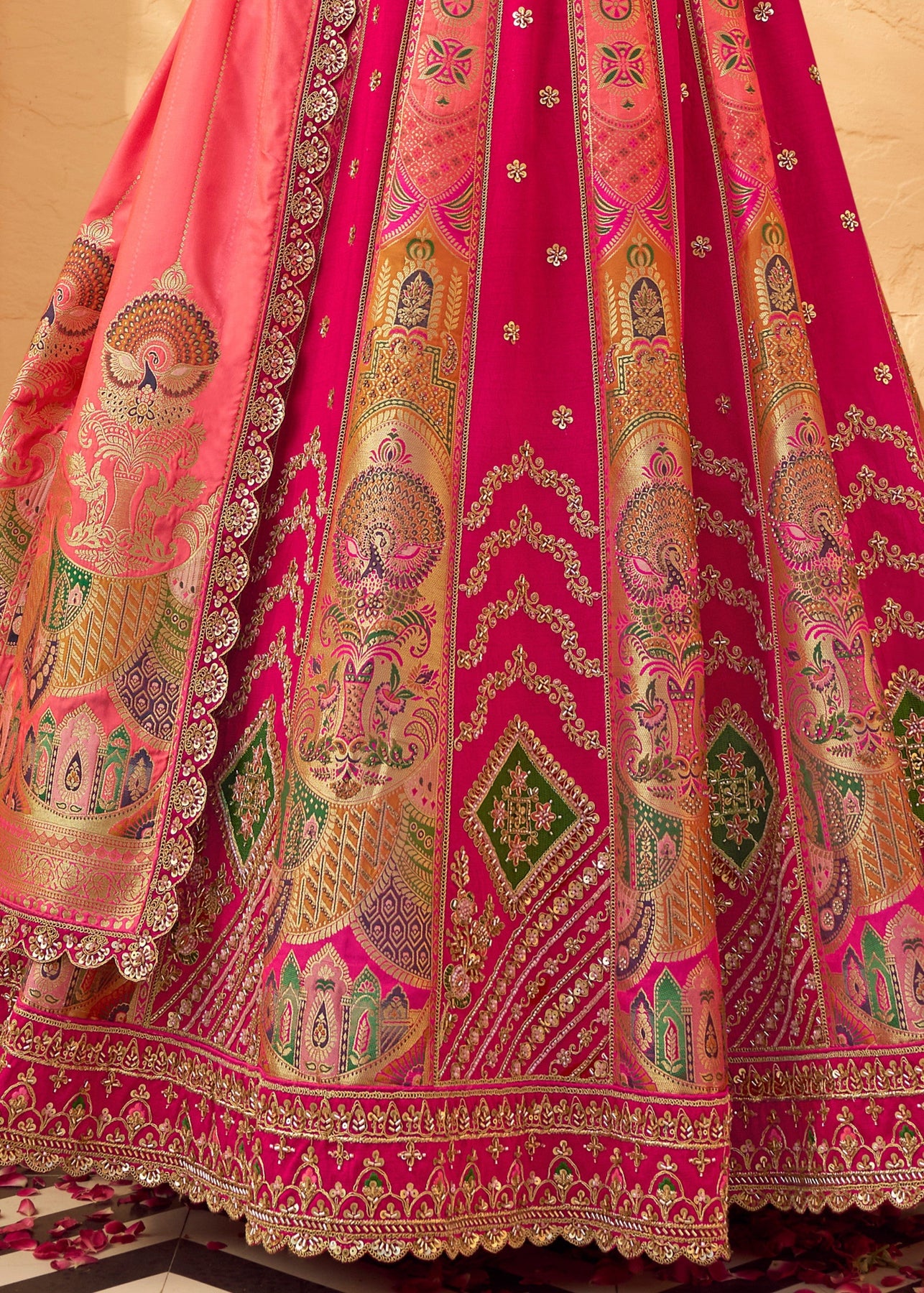 A dreamy candy‑pink Banarasi silk lehenga choli adorned with intricate zarkan and cut‑work, radiating regal elegance with every stitch. The rich blended Banarasi fabric brings a lustrous sheen, promises graceful twirls. The matching blouse and flowing dupatta complete the ensemble for a harmonised traditional look. Perfect for special celebrations or wedding soirées where you want to stand out in timeless craftsmanship.