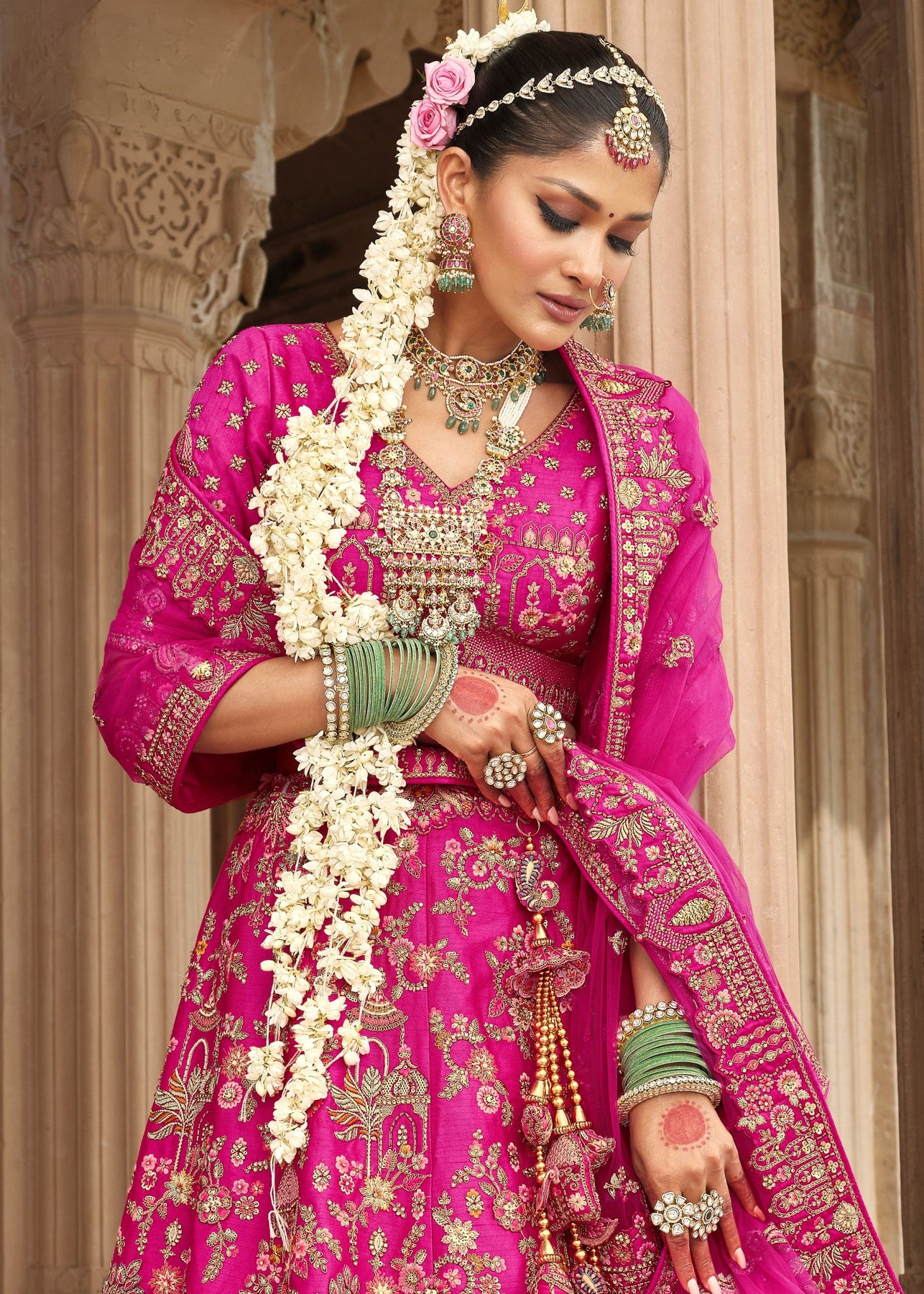 Magenta Pink Heavy Bridal Silk Lehenga With Khatli And Embroidery Work