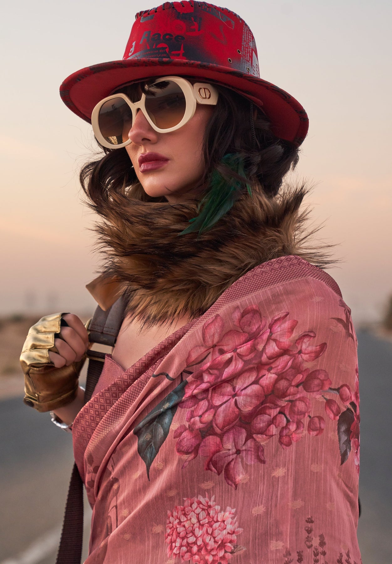 Brownish Pink Floral Printed Linen Saree with Zari Border and Blouse