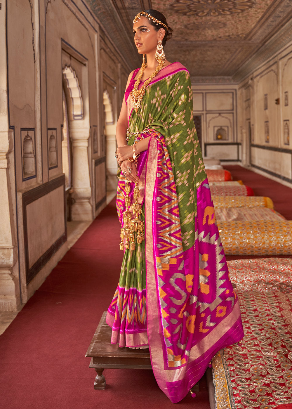 Green & Pink Printed Patola Dola Silk Saree with Zari Border