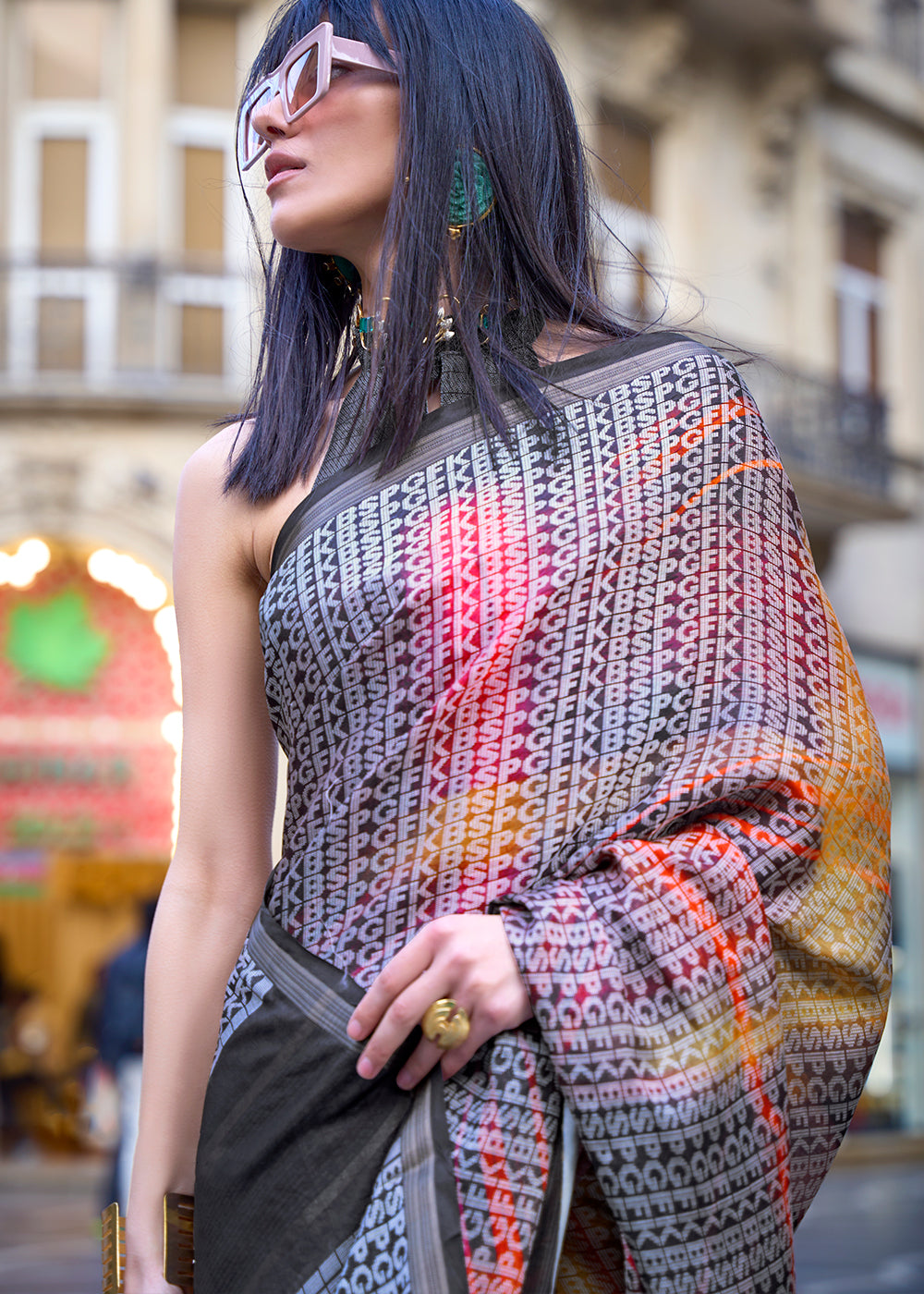 Black & Orange Digital Printed Poly Viscose Saree