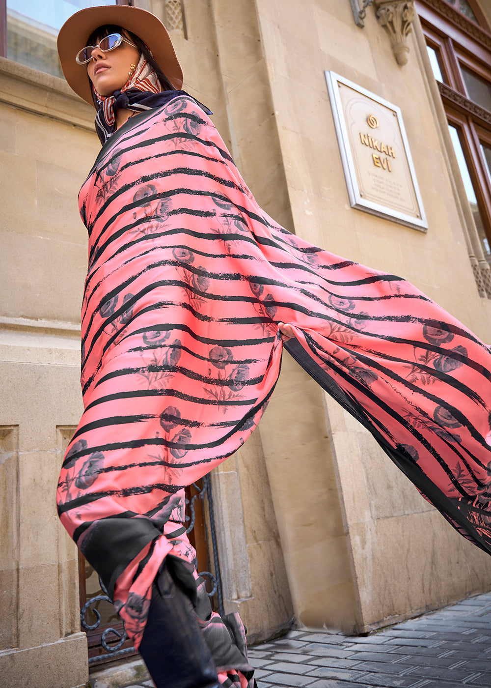 Satin crepe is a versatile fabric and this adaptability makes it a favoured choice in the fashion industry. With a lustrous and shiny appearance, this Coral Pink Designer drape is a visually appealing piece with a long-lasting finish. Drape it on your special evenings and infuse the aura with the elegance of a cinematic queen.
