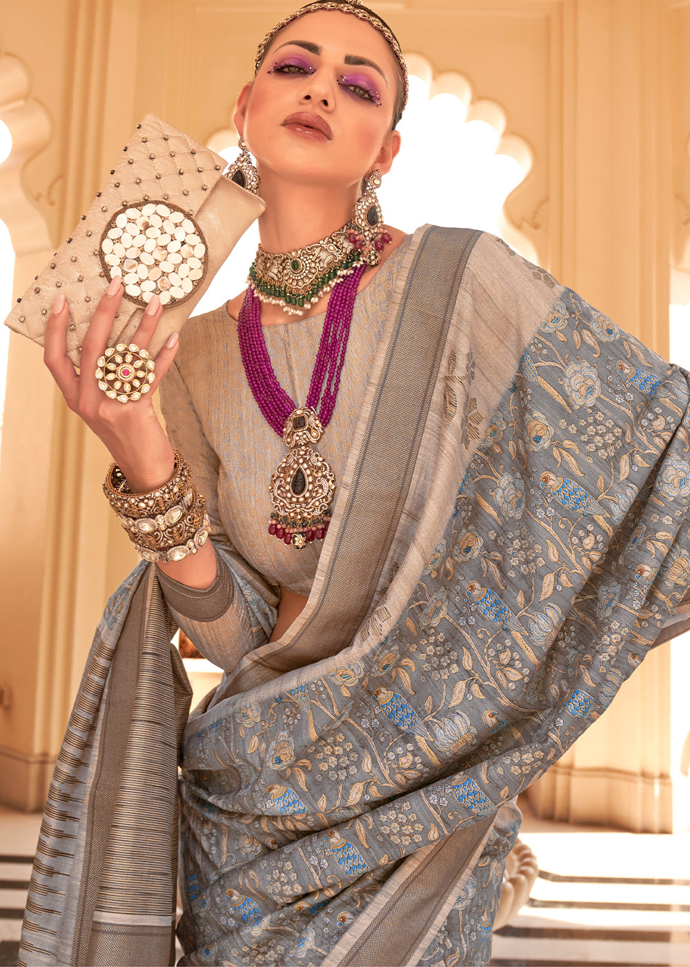 Lava Grey Khadi Printed Raw Silk Saree