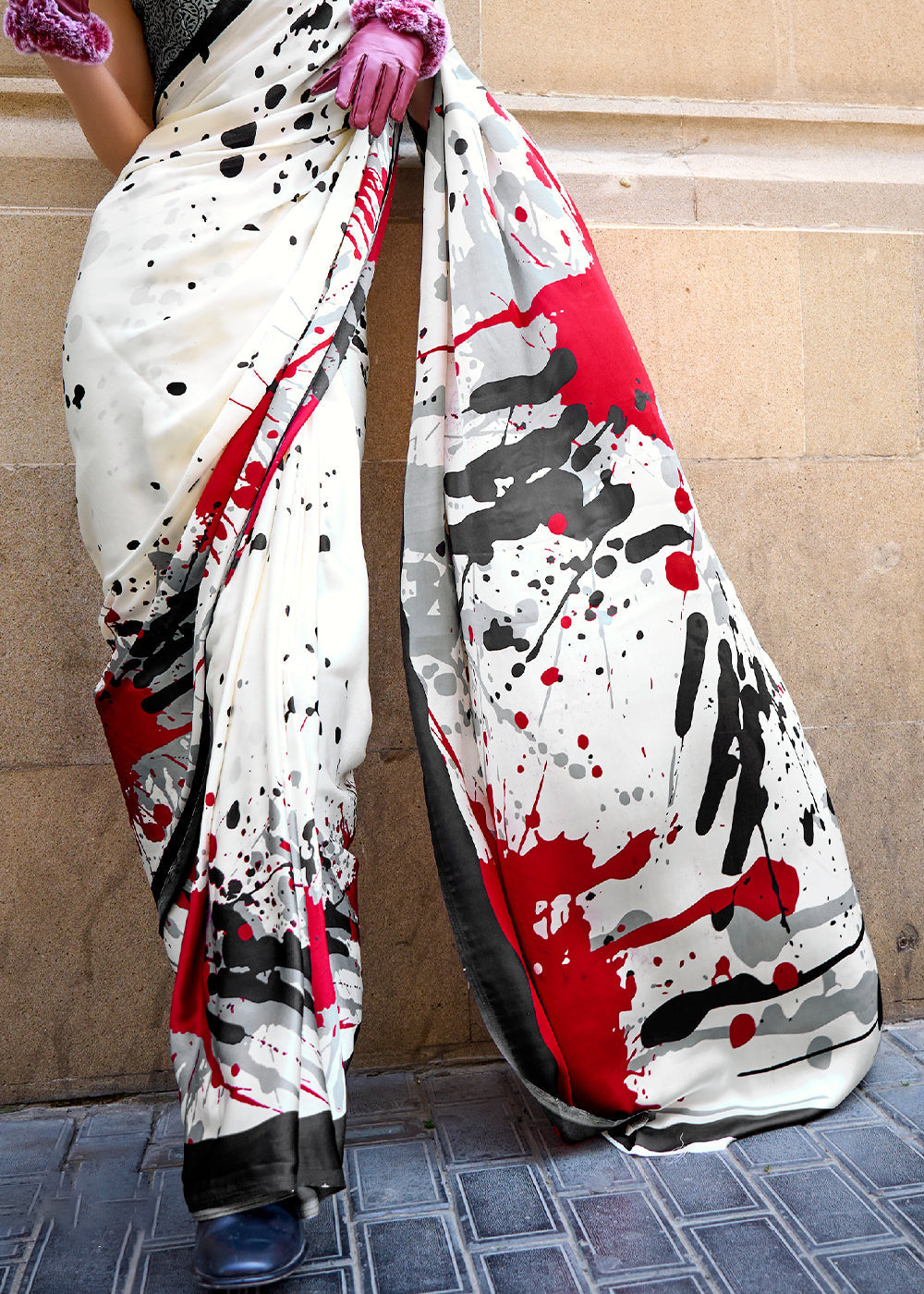 With an enchanting visual appeal, this Rice White Satin Crepe printed saree will be a lively addition to any wardrobe. Crisp in look and with a crimped appeal, this piece is sure to attract eyeballs with its captivating designer print. Pair it with trendy danglers and a modish blouse and garner compliments.
