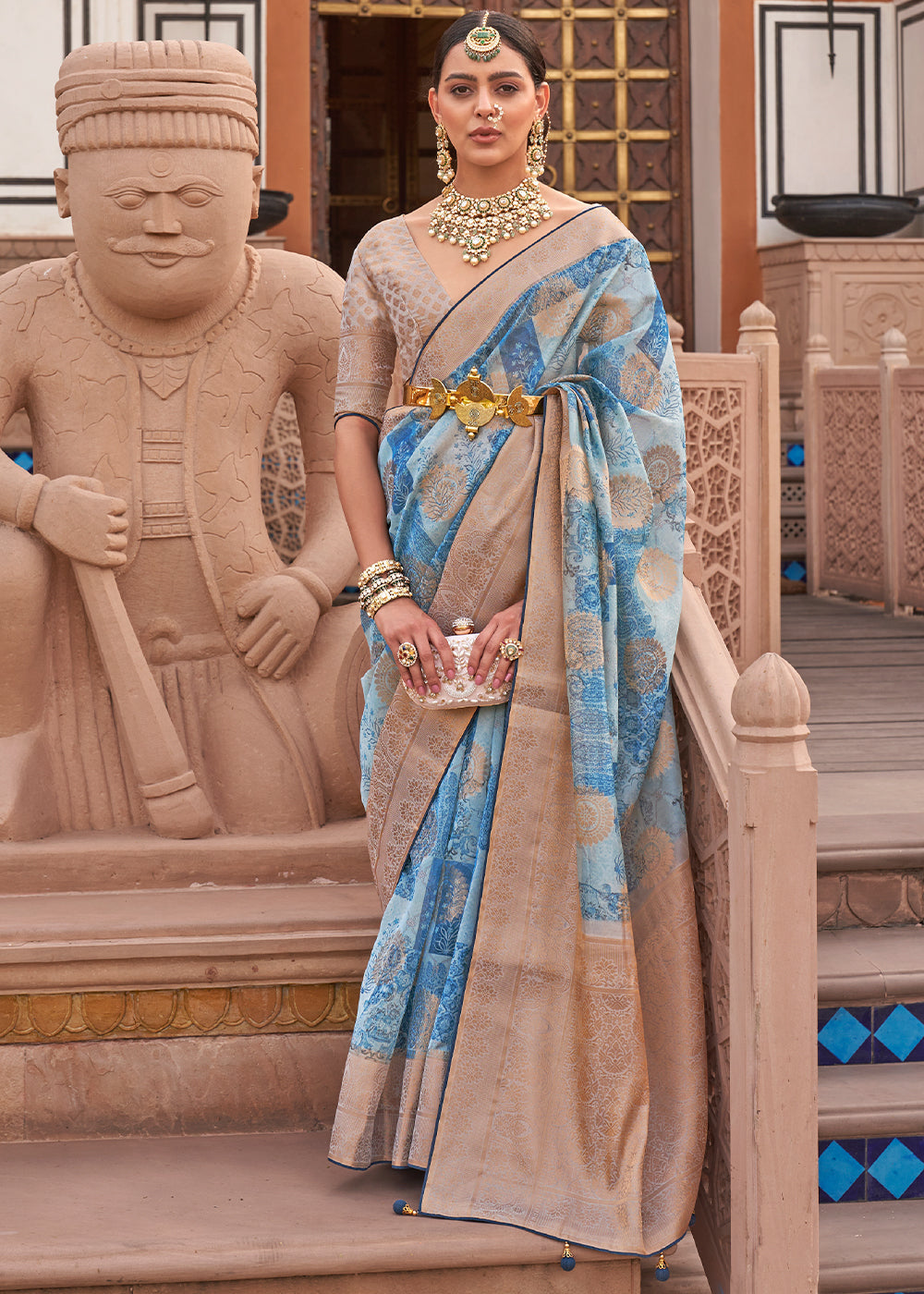Featuring a crisp and transparent quality with its luxurious texture and subtle shimmer, Organza silk sarees are a cherished treasure. This Digitally Printed saree in dynamic shades of blue adds a unique and personalized touch to your look. Pairing this with statement earrings will give your personality a timeless appeal.