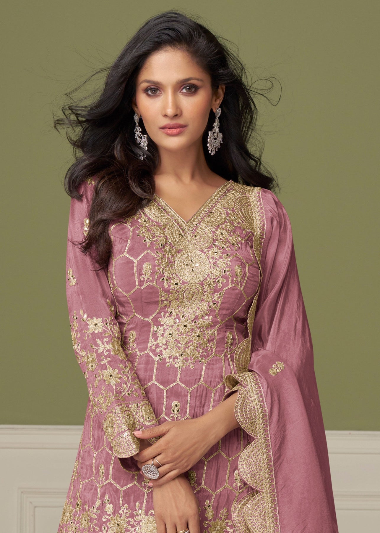 Elegant Dusty Rose Pink Silk Salwar Suit with golden embroidery