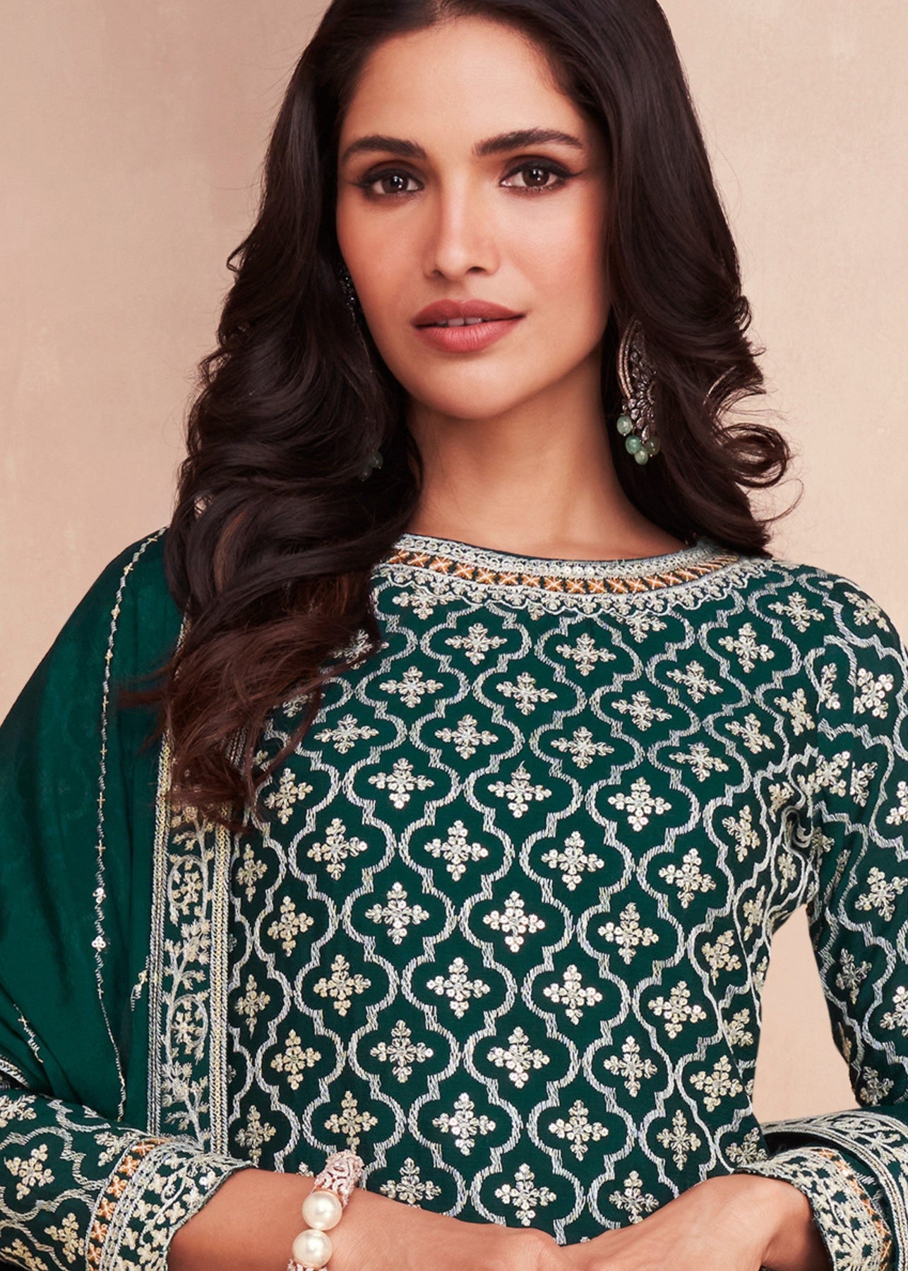 Exquisitely tailored in luxurious Hunter Green Chinon silk, The flowing skirt and well-fitted top are fully lined for comfort, ensuring a graceful drape and flattering silhouette. Adorned with delicate embroidery and tasteful embellishments, it strikes the perfect balance between traditional artistry and contemporary style. Ideal for festive occasions or formal gatherings, this ensemble delivers a polished, sophisticated statement.