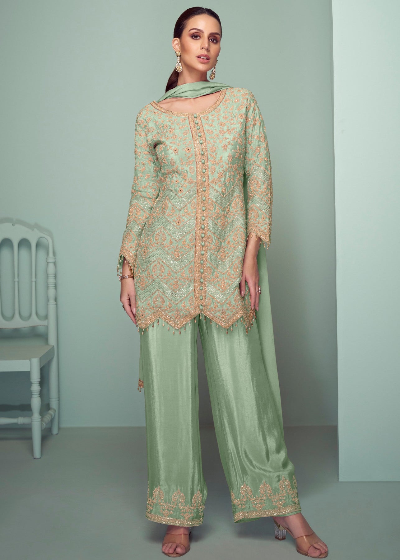 Spring Green Chinnon Silk Plazo Suit With Thread Embroidery