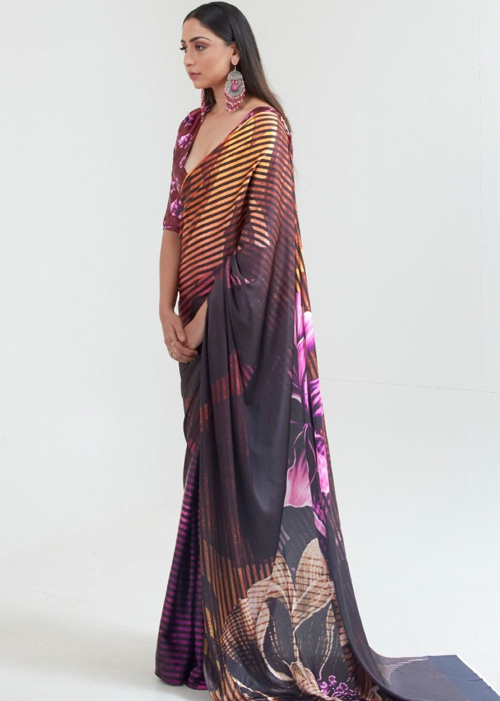 Our digitally printed Satin silk saree collection defines elegance and beauty in a contemporary way. Embellished with breathtaking prints and patterns these are apt for corporate and workwear. Choose this polished piece in blends of umber brown and black and garner the compliments that come your way with this refreshing piece of art.